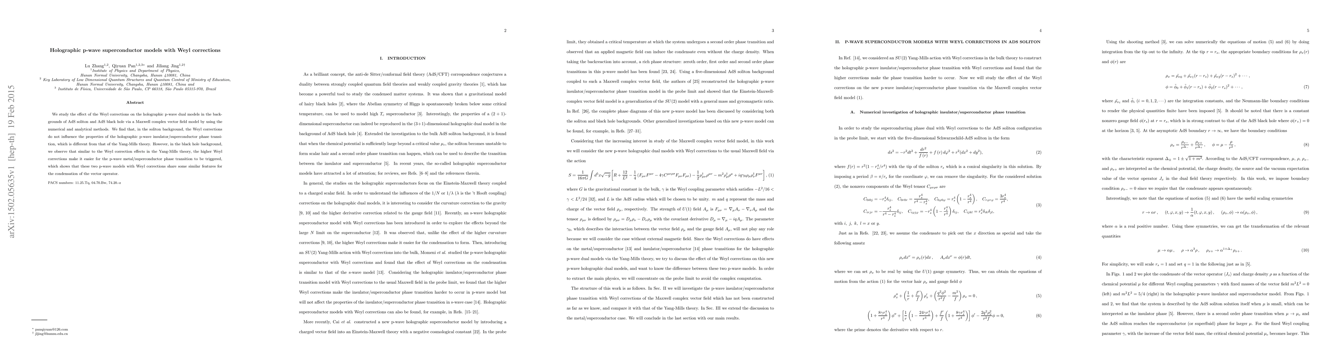 This paper investigates Weyl corrections' impact on holographic p-wave superconductor models in AdS soliton and black hole backgrounds. In soliton backgrounds, Weyl corrections do not affect the insulator/superconductor transition, unlike in Yang-Mills theory. In black hole backgrounds, higher Weyl corrections facilitate the metal/superconductor transition, indicating shared features with Yang-Mills theory in vector operator condensation.