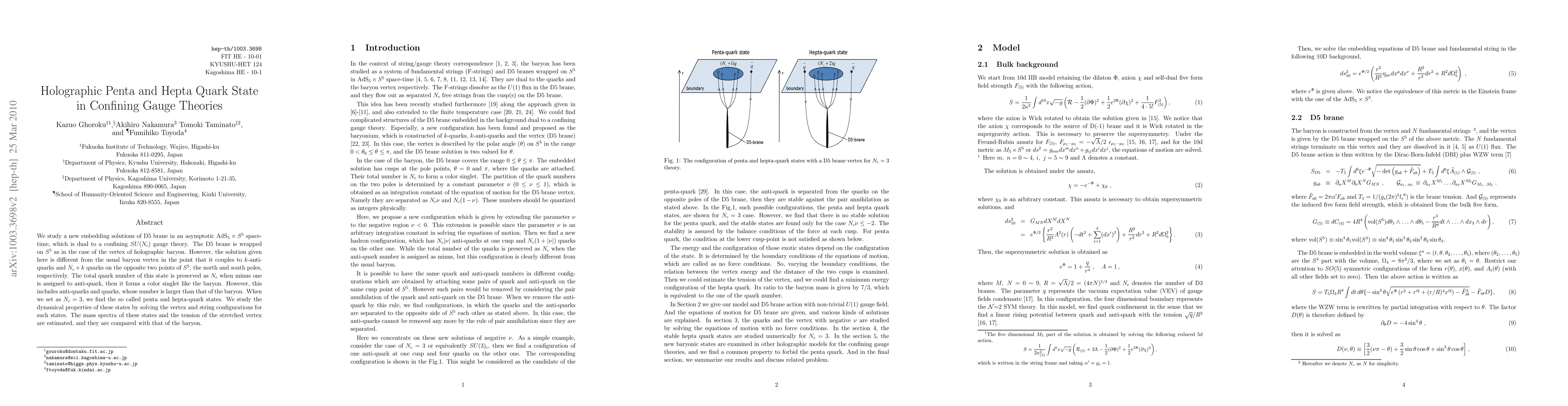 We study a new embedding solutions of D5 brane in an asymptotic AdS${}_5\times S^5$ space-time, which is dual to a confining $SU(N_c)$ gauge theory. The D5 brane is wrapped on $S^5$ as in the case of the vertex of holographic baryon. However, the solution given here is different from the usual baryon vertex in the point that it couples to $k$-anti-quarks and $N_c+k$ quarks on the opposite two points of $S^5$, the north and south poles, respectively. The total quark number of this state is preserved as $N_c$ when minus one is assigned to anti-quark, then it forms a color singlet like the baryon. However, this includes anti-quarks and quarks, whose number is larger than that of the baryon. When we set as $N_c=3$, we find the so called penta and hepta-quark states. We study the dynamical properties of these states by solving the vertex and string configurations for such states. The mass spectra of these states and the tension of the stretched vertex are estimated, and they are compared with that of the baryon.
