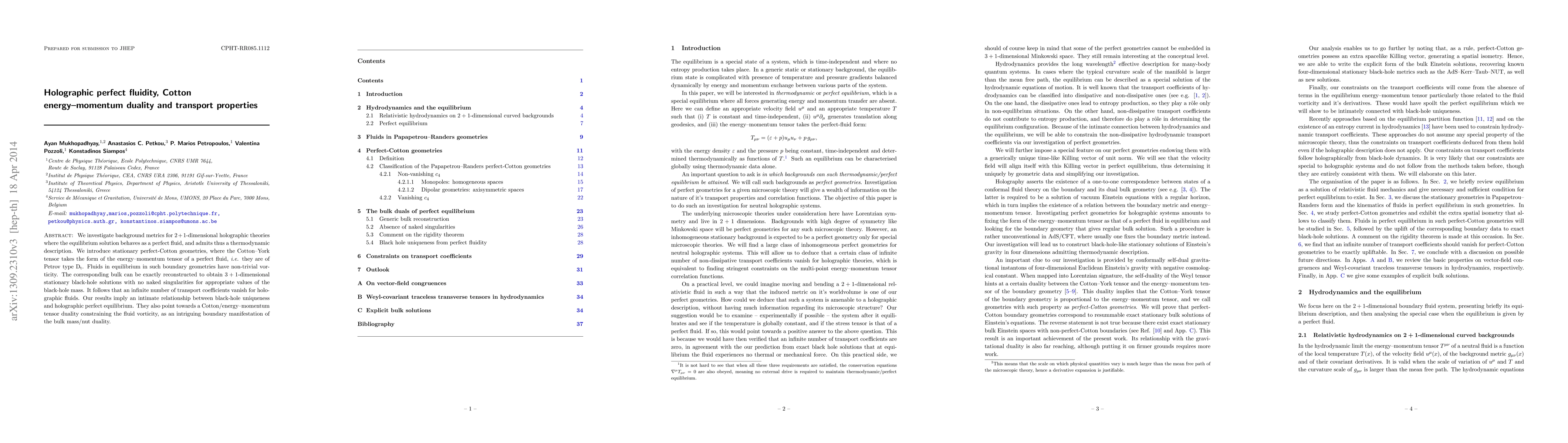 This paper explores 2+1-dimensional holographic theories with perfect fluid equilibrium, introducing stationary perfect-Cotton geometries that exhibit a Cotton-York tensor equivalent to a perfect fluid's energy-momentum tensor. The study reveals an intimate relationship between black-hole uniqueness and holographic perfect equilibrium, with an infinite number of transport coefficients vanishing, suggesting a duality between the Cotton tensor and the energy-momentum tensor.