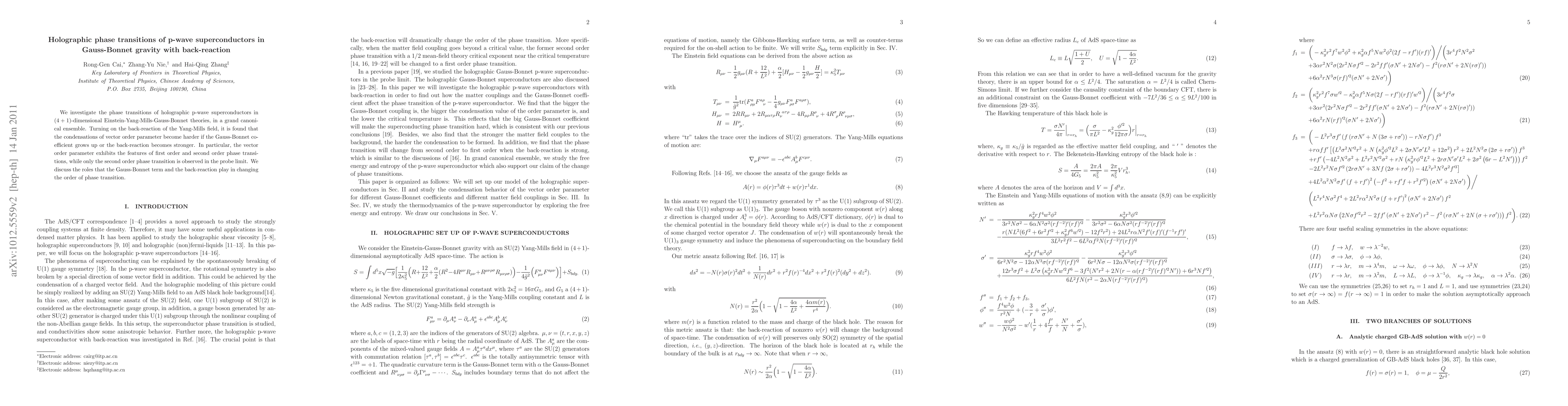 We investigate the phase transitions of holographic p-wave superconductors in (4+1)-dimensional Einstein-Yang-Mills-Gauss-Bonnet theories, in a grand canonical ensemble. Turning on the back-reaction of the Yang-Mills field, it is found that the condensations of vector order parameter become harder if the Gauss-Bonnet coefficient grows up or the back-reaction becomes stronger. In particular, the vector order parameter exhibits the features of first order and second order phase transitions, while only the second order phase transition is observed in the probe limit. We discuss the roles that the Gauss-Bonnet term and the back-reaction play in changing the order of phase transition.