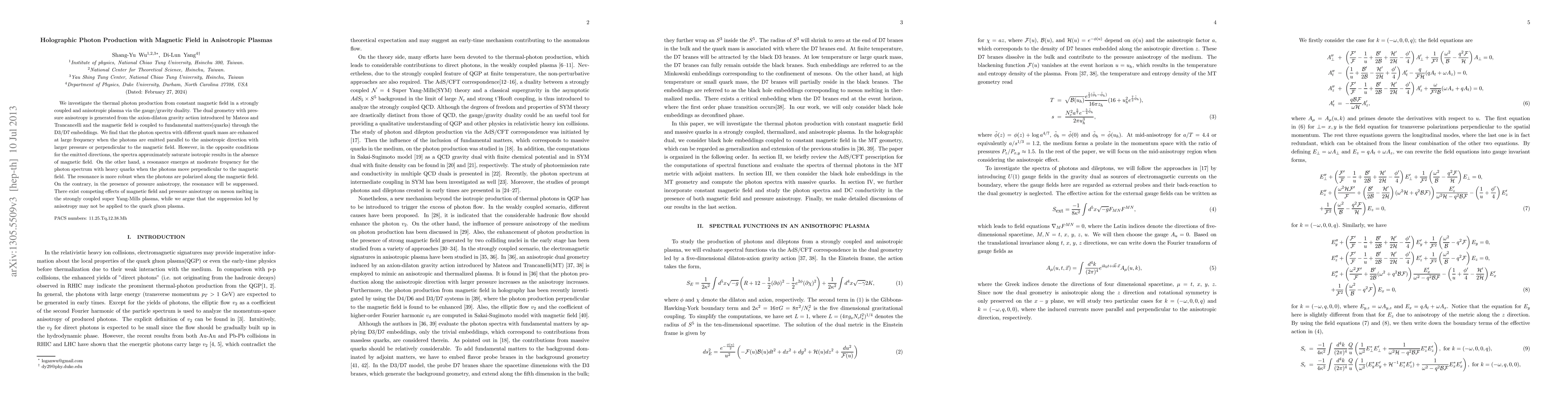 We investigate the thermal photon production from constant magnetic field in a strongly coupled and anisotropic plasma via the gauge/gravity duality. The dual geometry with pressure anisotropy is generated from the axion-dilaton gravity action introduced by Mateos and Trancancelli and the magnetic field is coupled to fundamental matters(quarks) through the D3/D7 embeddings. We find that the photon spectra with different quark mass are enhanced at large frequency when the photons are emitted parallel to the anisotropic direction with larger pressure or perpendicular to the magnetic field. However, in the opposite conditions for the emitted directions, the spectra approximately saturate isotropic results in the absence of magnetic field. On the other hand, a resonance emerges at moderate frequency for the photon spectrum with heavy quarks when the photons move perpendicular to the magnetic field. The resonance is more robust when the photons are polarized along the magnetic field. On the contrary, in the presence of pressure anisotropy, the resonance will be suppressed. There exist competing effects of magnetic field and pressure anisotropy on meson melting in the strongly coupled super Yang-Mills plasma, while we argue that the suppression led by anisotropy may not be applied to the quark gluon plasma.