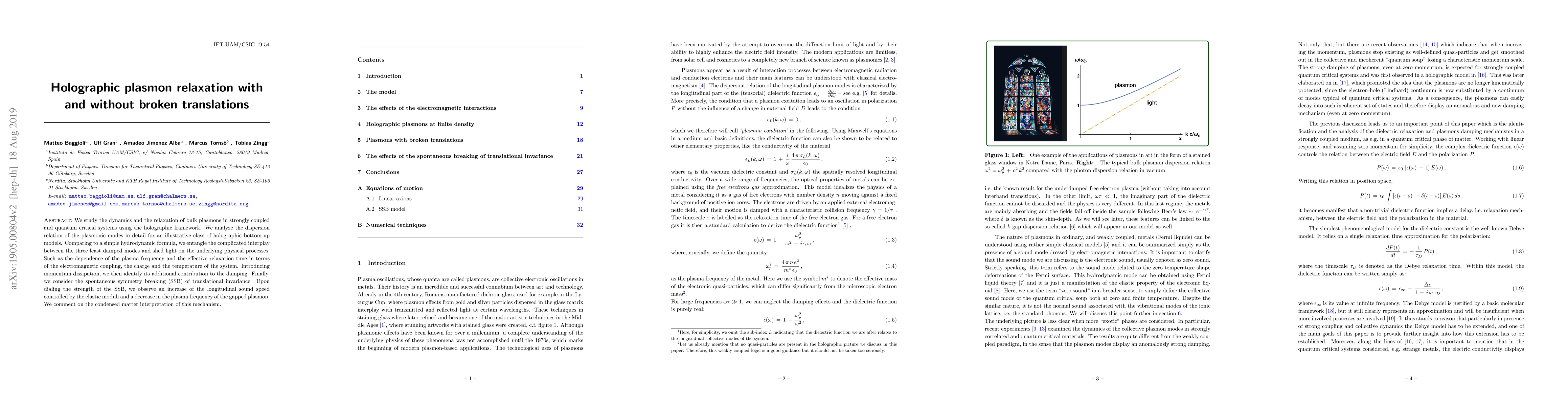 We study the dynamics and the relaxation of bulk plasmons in strongly coupled and quantum critical systems using the holographic framework. We analyze the dispersion relation of the plasmonic modes in detail for an illustrative class of holographic bottom-up models. Comparing to a simple hydrodynamic formula, we entangle the complicated interplay between the three least damped modes and shed light on the underlying physical processes. Such as the dependence of the plasma frequency and the effective relaxation time in terms of the electromagnetic coupling, the charge and the temperature of the system. Introducing momentum dissipation, we then identify its additional contribution to the damping. Finally, we consider the spontaneous symmetry breaking (SSB) of translational invariance. Upon dialing the strength of the SSB, we observe an increase of the longitudinal sound speed controlled by the elastic moduli and a decrease in the plasma frequency of the gapped plasmon. We comment on the condensed matter interpretation of this mechanism.