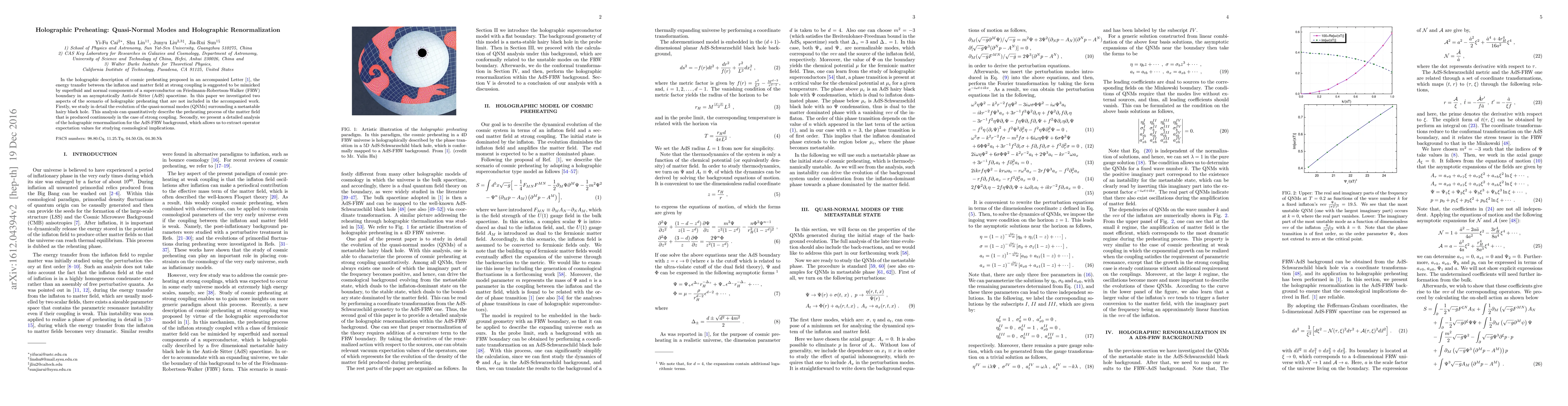 In the holographic description of cosmic preheating proposed in an accompanied Letter [1], the energy transfer between the inflaton and matter field at strong coupling is suggested to be mimicked by superfluid and normal components of a superconductor on Friedmann-Robertson-Walker (FRW) boundary in an asymptotically Anti-de Sitter (AdS) spacetime. In this paper we investigated two aspects of the scenario of holographic preheating that are not included in the accompanied work. Firstly, we study in detail the evolution of the quasi-normal modes (QNMs) surrounding a metastable hairy black hole. This analysis can quantitatively describe the preheating process of the matter field that is produced continuously in the case of strong coupling. Secondly, we present a detailed analysis of the holographic renormalization for the AdS-FRW background, which allows us to extract operator expectation values for studying cosmological implications.