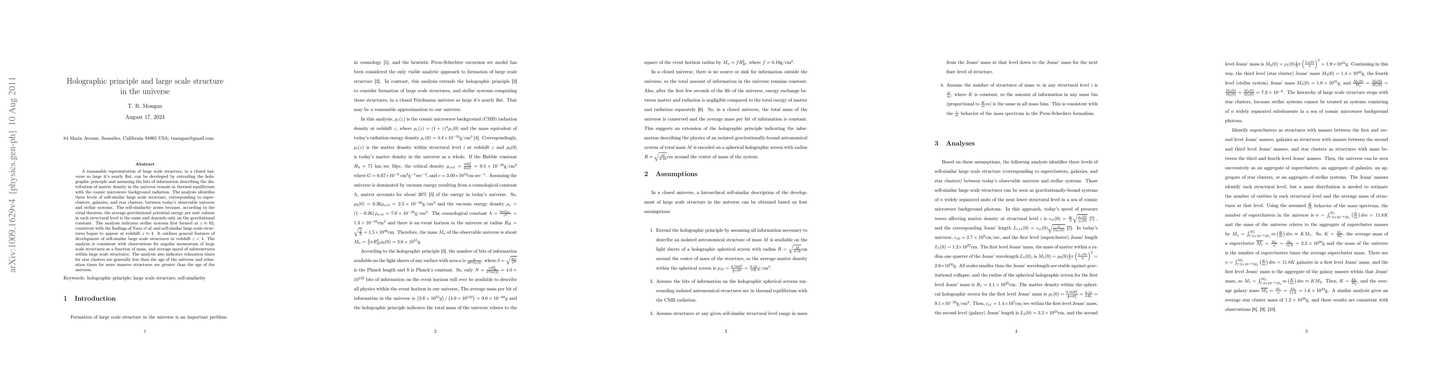 A reasonable representation of large scale structure, in a closed universe so large it's nearly flat, can be developed by extending the holographic principle and assuming the bits of information describing the distribution of matter density in the universe remain in thermal equilibrium with the cosmic microwave background radiation. The analysis identifies three levels of self-similar large scale structure, corresponding to superclusters, galaxies, and star clusters, between today's observable universe and stellar systems. The self-similarity arises because, according to the virial theorem, the average gravitational potential energy per unit volume in each structural level is the same and depends only on the gravitational constant. The analysis indicates stellar systems first formed at z\approx62, consistent with the findings of Naoz et al, and self-similar large scale structures began to appear at redshift z\approx4. It outlines general features of development of self-similar large scale structures at redshift z<4. The analysis is consistent with observations for angular momentum of large scale structures as a function of mass, and average speed of substructures within large scale structures. The analysis also indicates relaxation times for star clusters are generally less than the age of the universe and relaxation times for more massive structures are greater than the age of the universe.