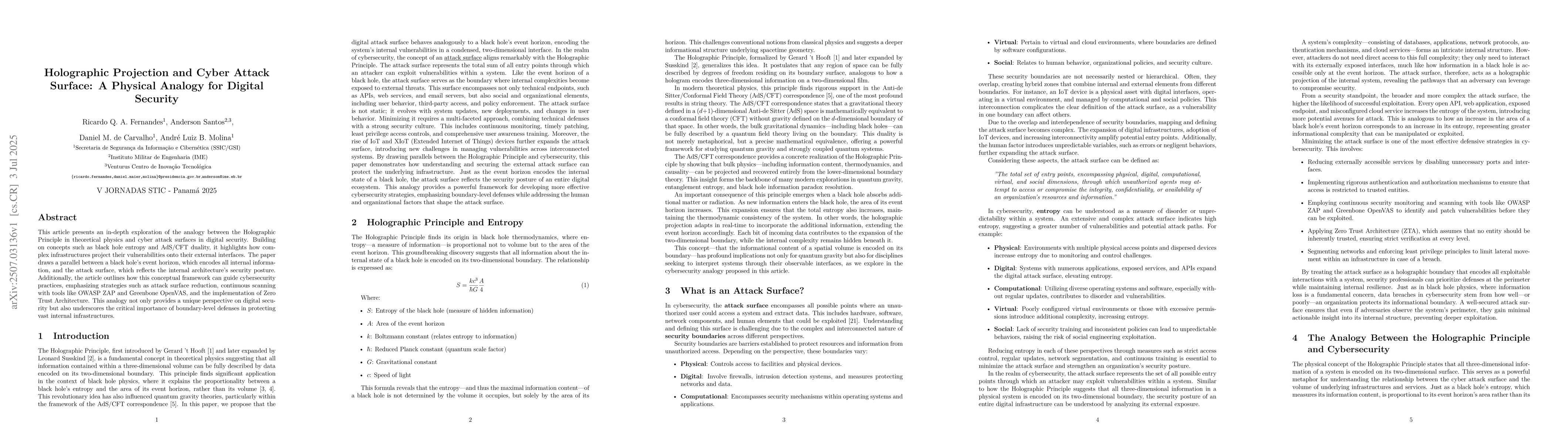 This article presents an in-depth exploration of the analogy between the Holographic Principle in theoretical physics and cyber attack surfaces in digital security. Building on concepts such as black hole entropy and AdS/CFT duality, it highlights how complex infrastructures project their vulnerabilities onto their external interfaces. The paper draws a parallel between a black hole's event horizon, which encodes all internal information, and the attack surface, which reflects the internal architecture's security posture. Additionally, the article outlines how this conceptual framework can guide cybersecurity practices, emphasizing strategies such as attack surface reduction, continuous scanning with tools like OWASP ZAP and Greenbone OpenVAS, and the implementation of Zero Trust Architecture. This analogy not only provides a unique perspective on digital security but also underscores the critical importance of boundary-level defenses in protecting vast internal infrastructures.