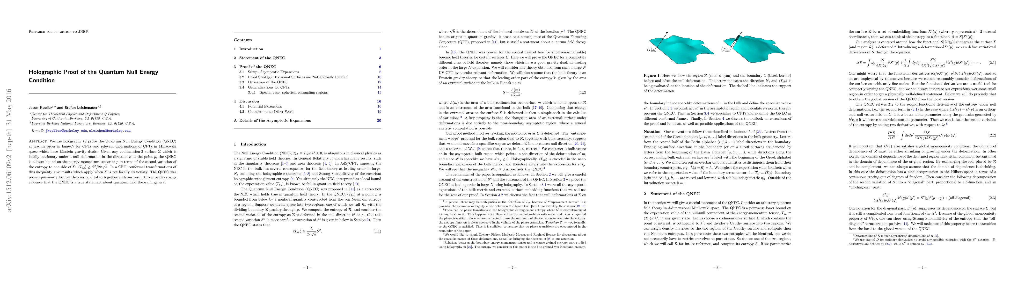 This paper uses holography to prove the Quantum Null Energy Condition (QNEC) at leading order in large-$N$ for conformal field theories (CFTs) and their deformations in Minkowski space with Einstein gravity duals, providing evidence that the QNEC holds generally in quantum field theory. The QNEC establishes a lower bound on the energy-momentum tensor in terms of the entropy's second variation.
