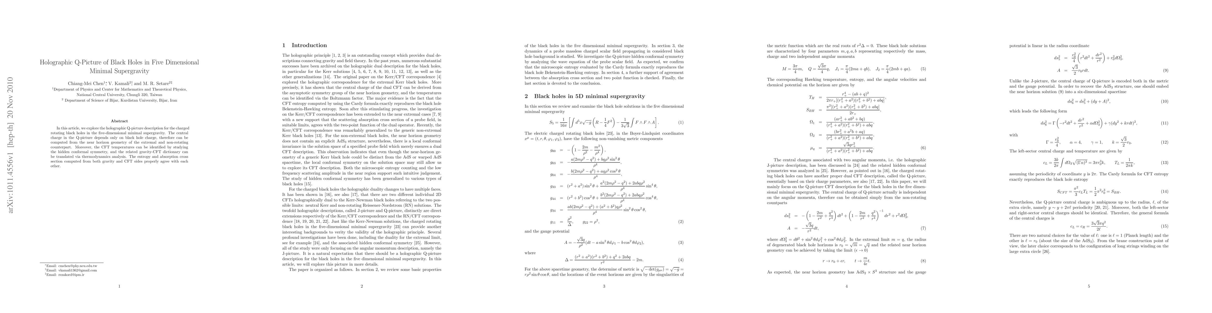 This paper investigates the holographic Q-picture for five-dimensional minimal supergravity's charged rotating black holes, showing that the central charge depends solely on black hole charge and can be derived from the near horizon geometry of extremal, non-rotating counterparts. The study also identifies CFT temperatures through hidden conformal symmetry and confirms that entropy and absorption cross section calculations from both gravity and CFT perspectives match.