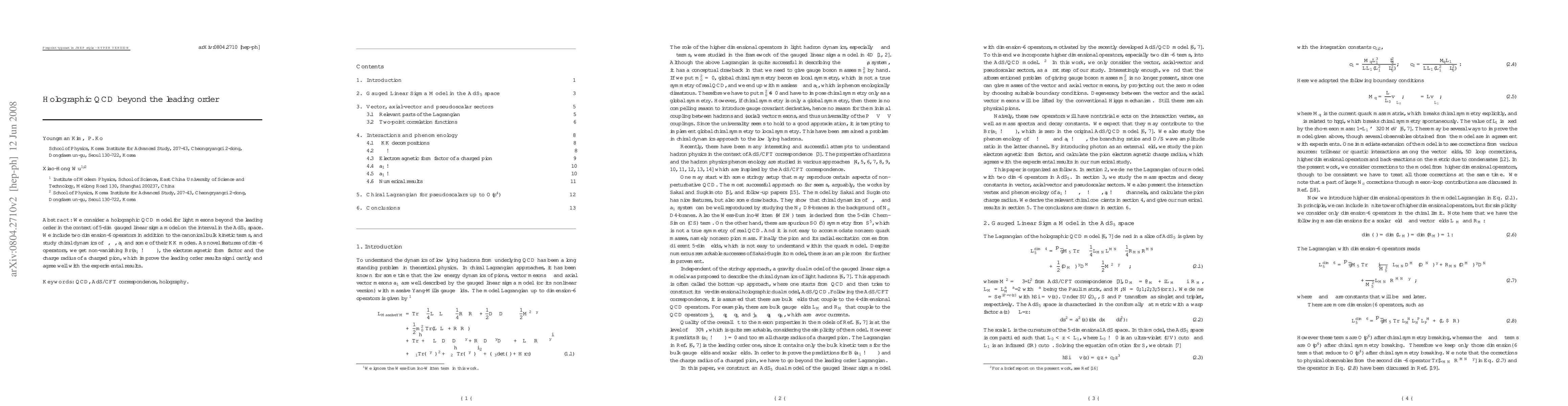 This paper extends a holographic QCD model to beyond the leading order by incorporating dimension-6 operators in a 5-dimensional gauged linear sigma model on AdS$_5$ space. It studies the chiral dynamics of light mesons, achieving improved results for decay rates, electromagnetic form factors, and charge radius that align well with experimental data.