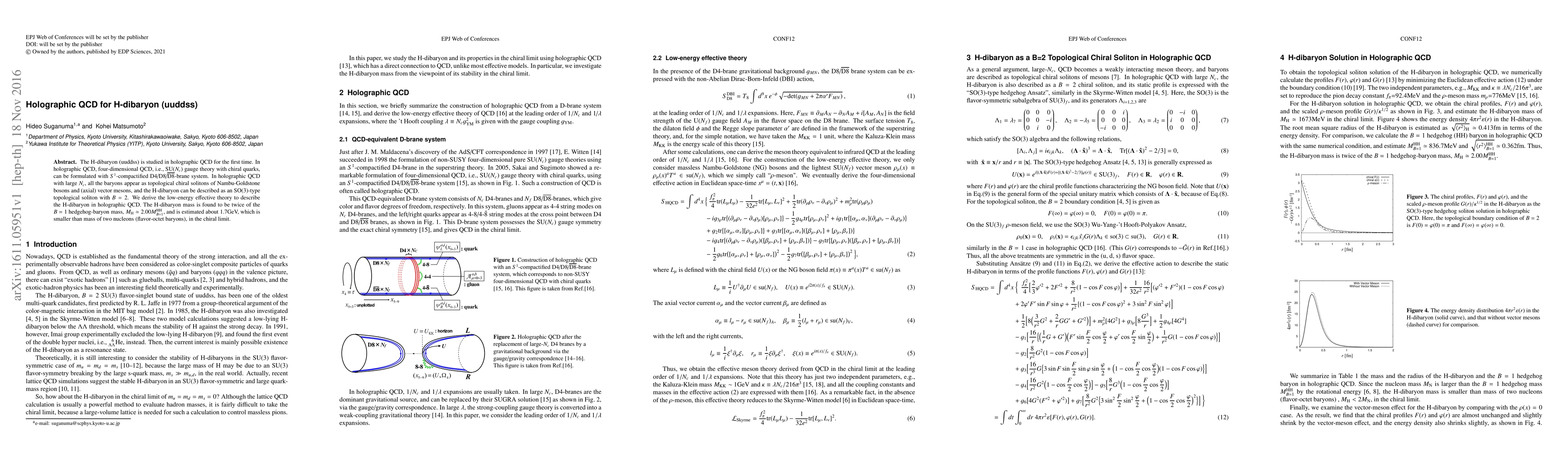 This paper introduces the study of the H-dibaryon (uuddss) in holographic QCD, revealing it as an SO(3)-type topological soliton. The derived low-energy effective theory estimates the H-dibaryon mass at approximately 1.7 GeV, which is smaller than the combined mass of two nucleons.