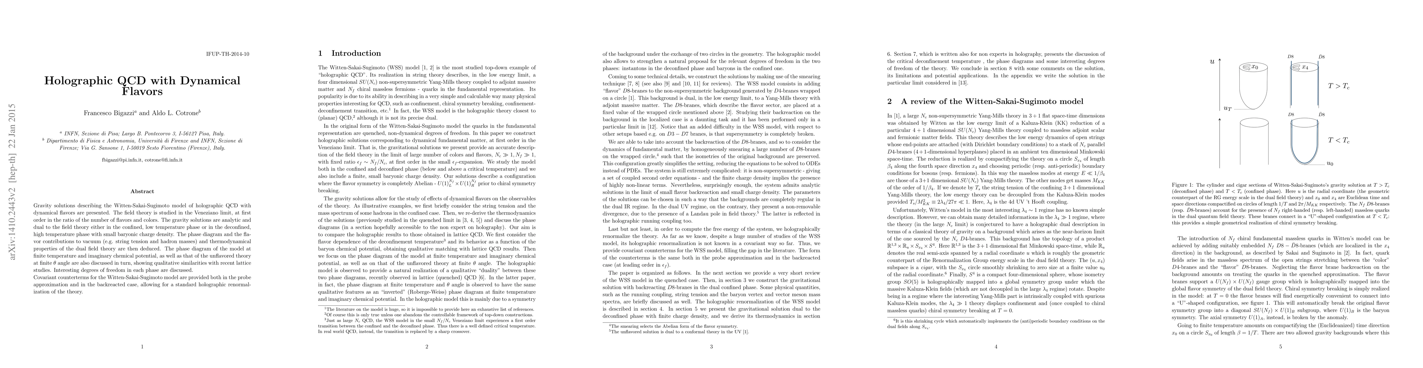 Gravity solutions describing the Witten-Sakai-Sugimoto model of holographic QCD with dynamical flavors are presented. The field theory is studied in the Veneziano limit, at first order in the ratio of the number of flavors and colors. The gravity solutions are analytic and dual to the field theory either in the confined, low temperature phase or in the deconfined, high temperature phase with small baryonic charge density. The phase diagram and the flavor contributions to vacuum (e.g. string tension and hadron masses) and thermodynamical properties of the dual field theory are then deduced. The phase diagram of the model at finite temperature and imaginary chemical potential, as well as that of the unflavored theory at finite theta angle are also discussed in turn, showing qualitative similarities with recent lattice studies. Interesting degrees of freedom in each phase are discussed. Covariant counterterms for the Witten-Sakai-Sugimoto model are provided both in the probe approximation and in the backreacted case, allowing for a standard holographic renormalization of the theory.