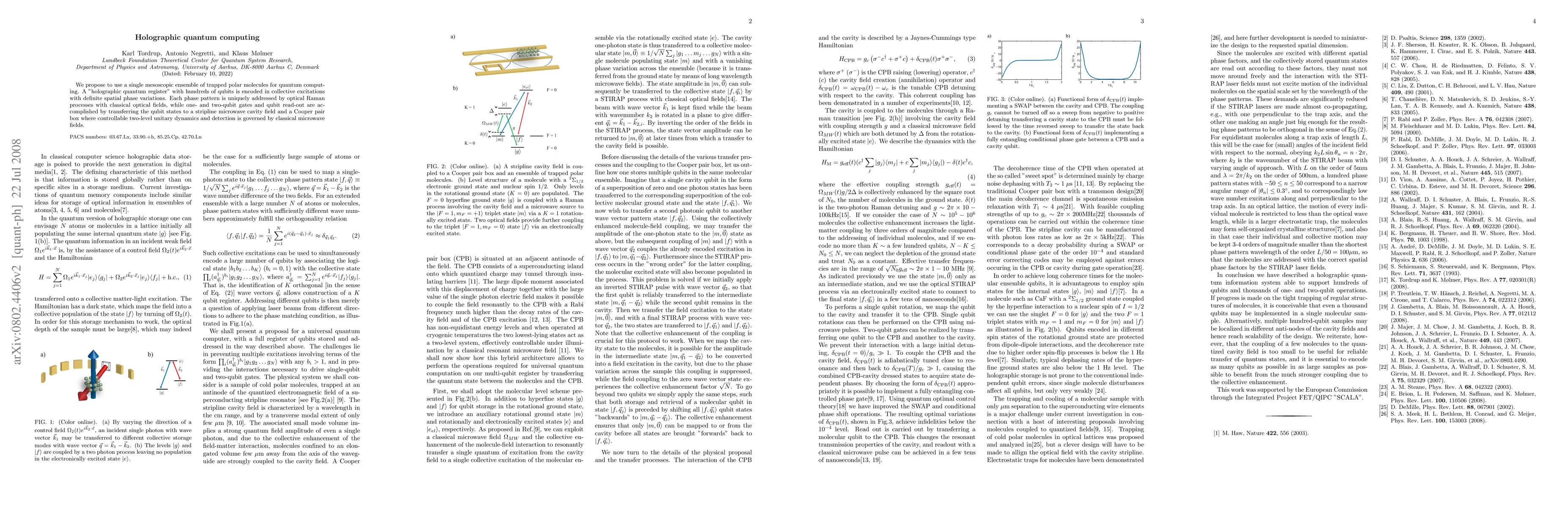 We propose that a single mesoscopic ensemble of trapped polar molecules can support a "holographic quantum computer" with hundreds of qubits encoded in collective excitations with definite spatial phase variations. Each phase pattern is uniquely addressed by optical Raman processes with classical optical fields, while one- and two-qubit gates are accomplished by selectively transferring the individual qubit states to a stripline microwave cavity field and a Cooper pair box where controllable two-level unitary dynamics is governed by classical microwave fields.