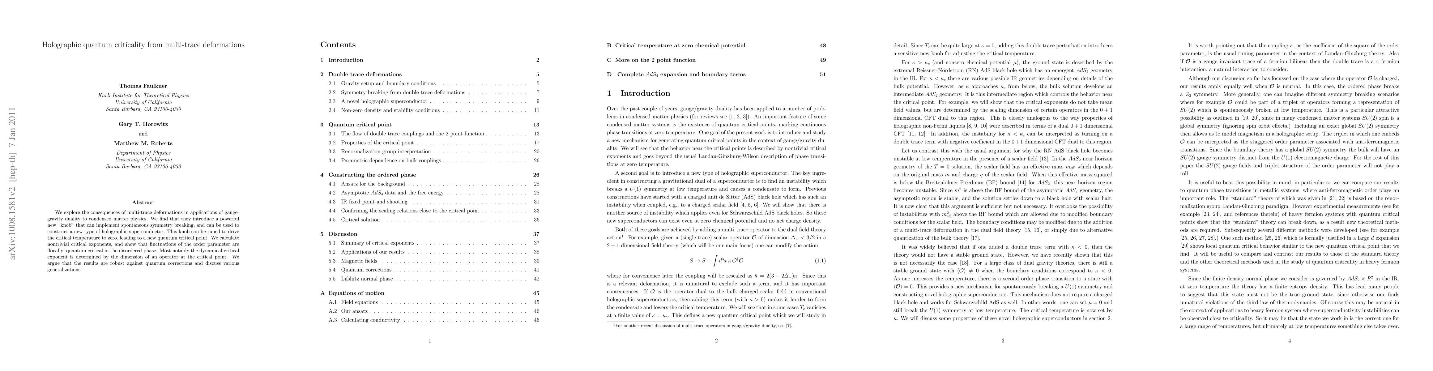 We explore the consequences of multi-trace deformations in applications of gauge-gravity duality to condensed matter physics. We find that they introduce a powerful new "knob" that can implement spontaneous symmetry breaking, and can be used to construct a new type of holographic superconductor. This knob can be tuned to drive the critical temperature to zero, leading to a new quantum critical point. We calculate nontrivial critical exponents, and show that fluctuations of the order parameter are `locally' quantum critical in the disordered phase. Most notably the dynamical critical exponent is determined by the dimension of an operator at the critical point. We argue that the results are robust against quantum corrections and discuss various generalizations.