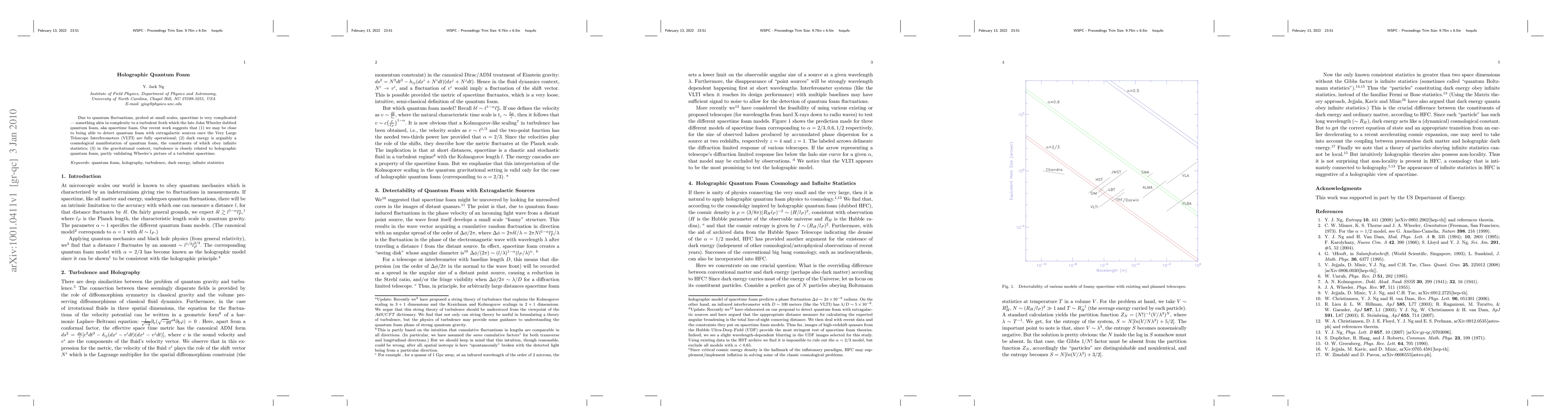 This paper explores the complexity of spacetime at small scales, suggesting that quantum foam may be detectable with future Very Large Telescope Interferometers. It posits that dark energy could be a manifestation of quantum foam, with its constituents following infinite statistics, and links gravitational turbulence to holographic quantum foam.