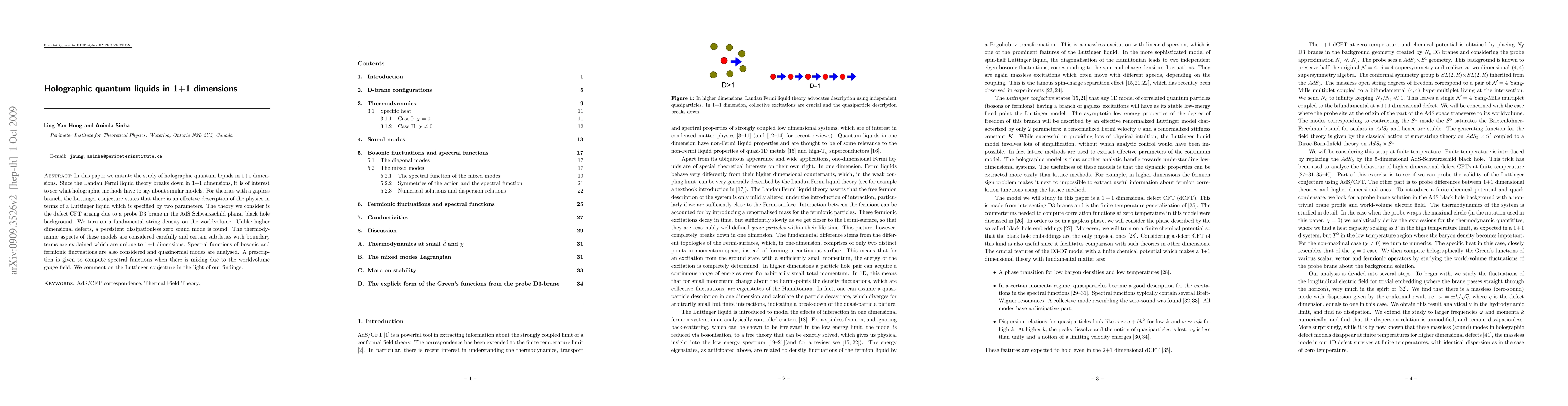 This paper explores holographic quantum liquids in 1+1 dimensions, using a defect CFT from a probe D3 brane in AdS Schwarzschild background, and finds a persistent dissipationless zero sound mode. The study also examines thermodynamic subtleties, spectral functions, and quasinormal modes, providing insights into the Luttinger conjecture.
