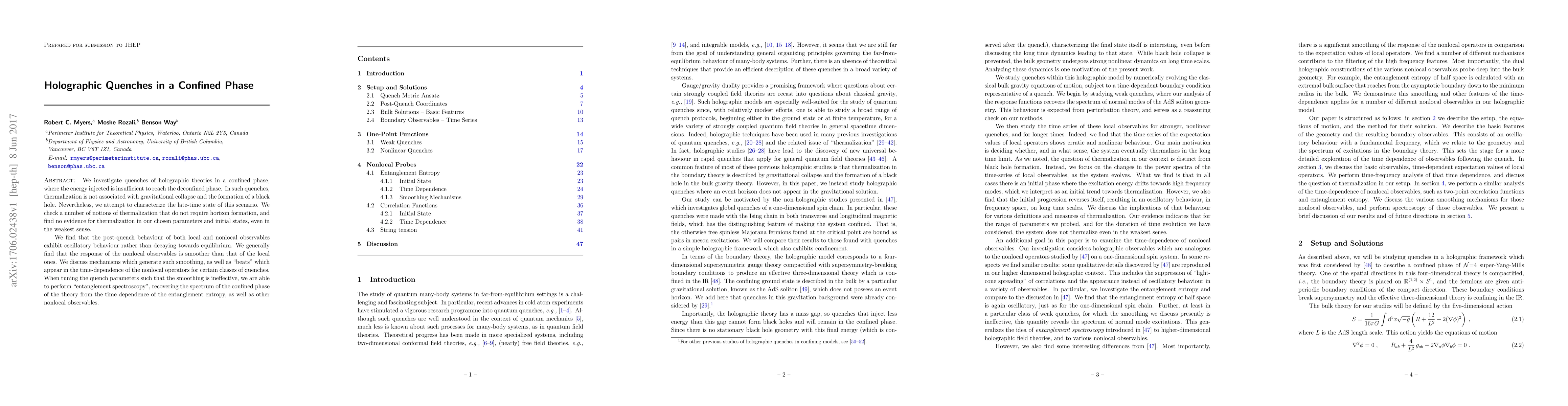 We investigate quenches of holographic theories in a confined phase, where the energy injected is insufficient to reach the deconfined phase. In such quenches, thermalization is not associated with gravitational collapse and the formation of a black hole. Nevertheless, we attempt to characterize the late-time state of this scenario. We check a number of notions of thermalization that do not require horizon formation, and find no evidence for thermalization in our chosen parameters and initial states, even in the weakest sense. We find that the post-quench behaviour of both local and nonlocal observables exhibit oscillatory behaviour rather than decaying towards equilibrium. We generally find that the response of the nonlocal observables is smoother than that of the local ones. We discuss mechanisms which generate such smoothing, as well as "beats" which appear in the time-dependence of the nonlocal operators for certain classes of quenches. When tuning the quench parameters such that the smoothing is ineffective, we are able to perform "entanglement spectroscopy", recovering the spectrum of the confined phase of the theory from the time dependence of the entanglement entropy, as well as other nonlocal observables.