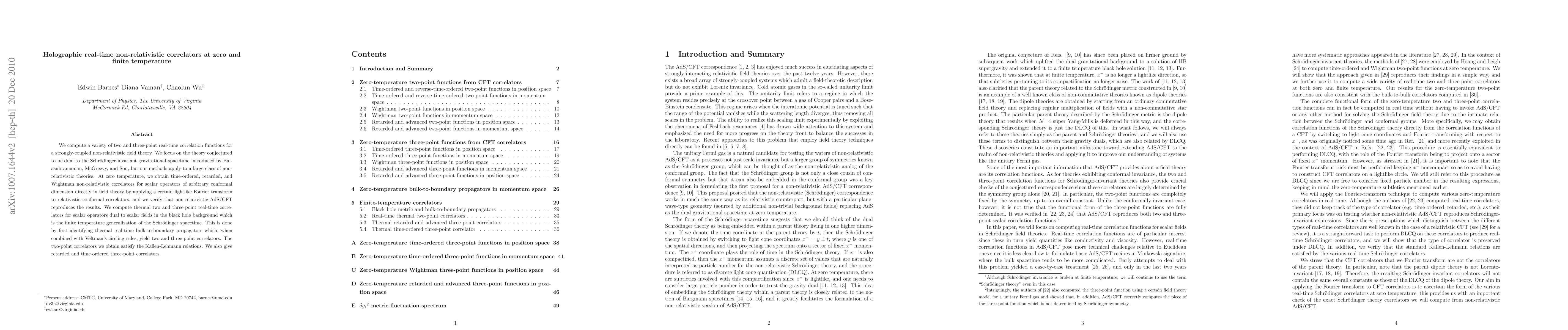 This paper computes real-time correlators for strongly-coupled non-relativistic field theories, focusing on a theory dual to a Schrödinger-invariant gravitational spacetime. At zero temperature, it derives non-relativistic correlators via a lightlike Fourier transform, verifying non-relativistic AdS/CFT results. At finite temperature, it calculates thermal correlators in a black hole background, satisfying Kallen-Lehmann relations and providing retarded and time-ordered three-point correlators.