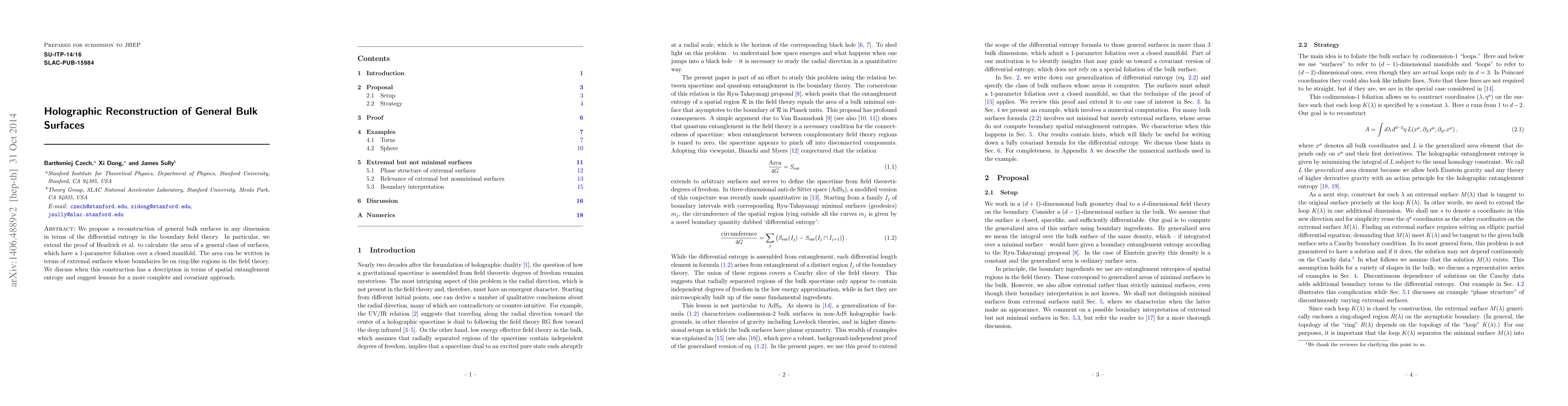 We propose a reconstruction of general bulk surfaces in any dimension in terms of the differential entropy in the boundary field theory. In particular, we extend the proof of Headrick et al. to calculate the area of a general class of surfaces, which have a 1-parameter foliation over a closed manifold. The area can be written in terms of extremal surfaces whose boundaries lie on ring-like regions in the field theory. We discuss when this construction has a description in terms of spatial entanglement entropy and suggest lessons for a more complete and covariant approach.