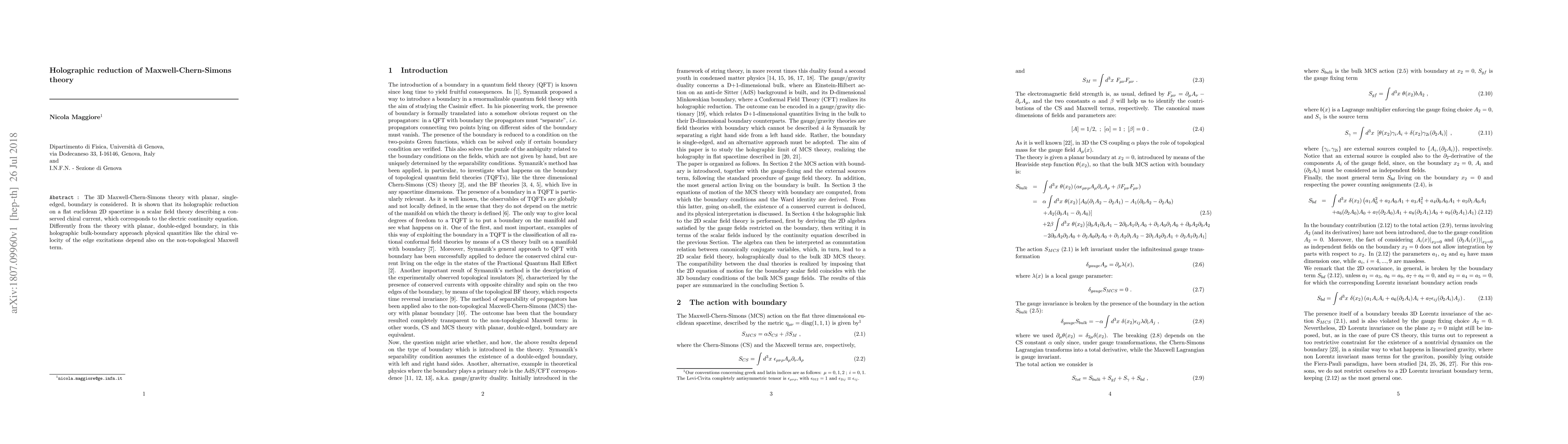 This paper demonstrates the holographic reduction of 3D Maxwell-Chern-Simons theory, revealing a 2D scalar field theory that describes a conserved chiral current. Unlike theories with double-edged boundaries, this reduction shows that physical quantities, such as the chiral velocity, depend on both topological and non-topological Maxwell terms.