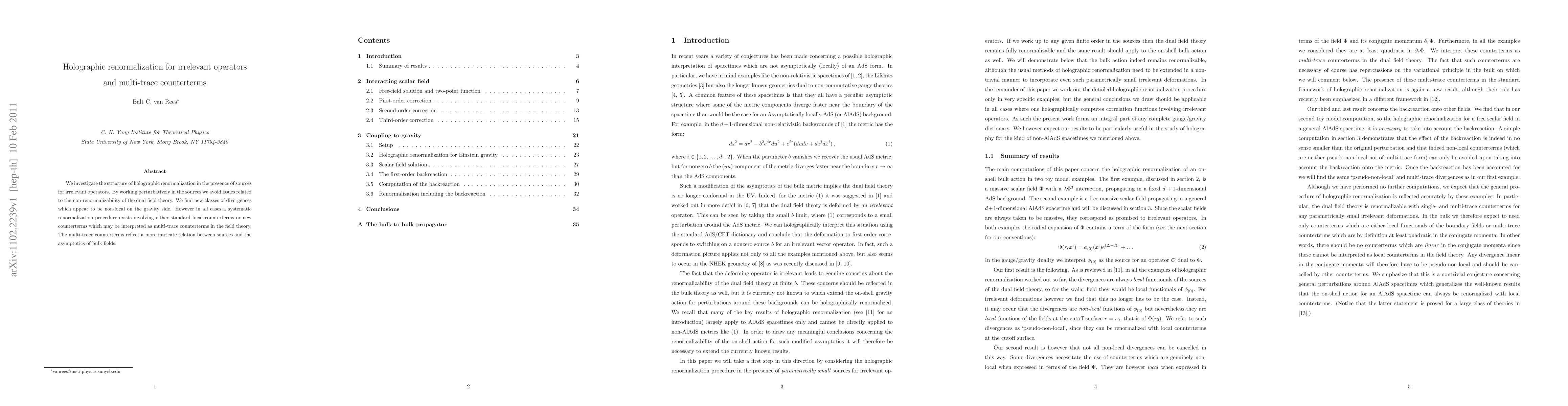 This paper explores holographic renormalization for irrelevant operators, revealing new non-local divergences in gravity. A systematic renormalization procedure is developed using either standard or new multi-trace counterterms, which reflect a more complex relationship between sources and bulk field asymptotics.