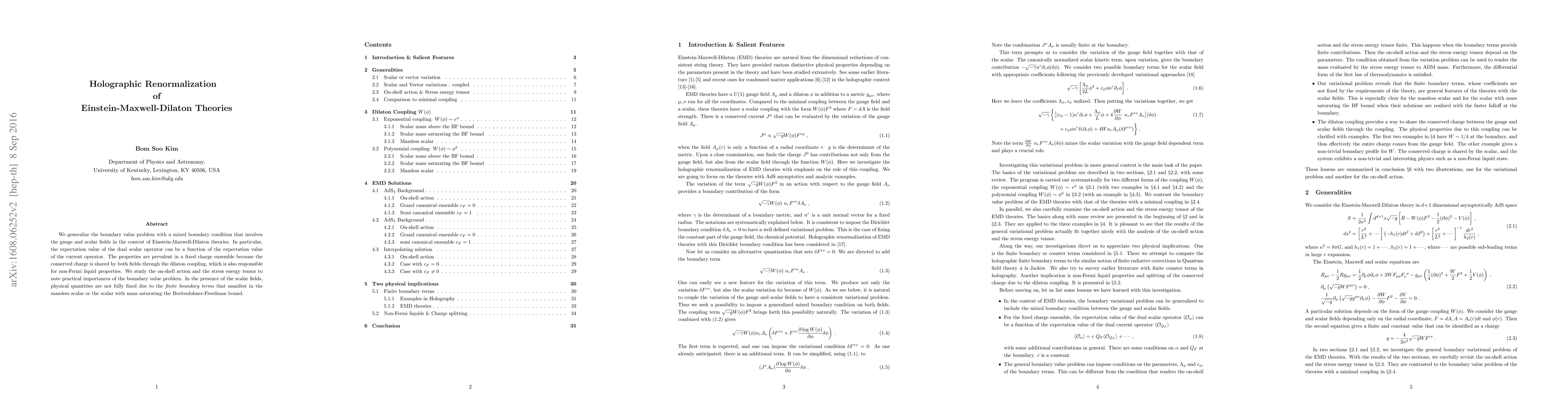 This research generalizes boundary conditions in Einstein-Maxwell-Dilaton theories, allowing for a mixed condition involving gauge and scalar fields. It explores how expectation values of dual scalar and current operators relate, revealing non-Fermi liquid properties through dilaton coupling, and analyzes implications for on-shell action and stress-energy tensor, noting that physical quantities remain indeterminate due to finite boundary terms in certain scalar field scenarios.