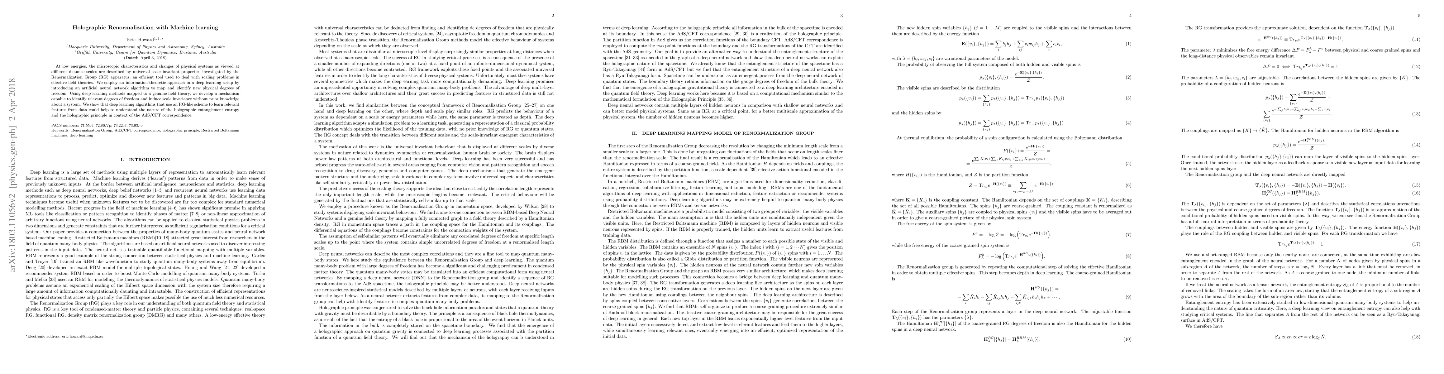 This paper utilizes deep learning algorithms to map and identify new physical degrees of freedom in low-energy systems, employing an information-theoretic approach. The study demonstrates that machine learning can induce scale invariance and understand the nature of holographic entanglement entropy, leveraging the AdS/CFT correspondence without prior knowledge of the system.