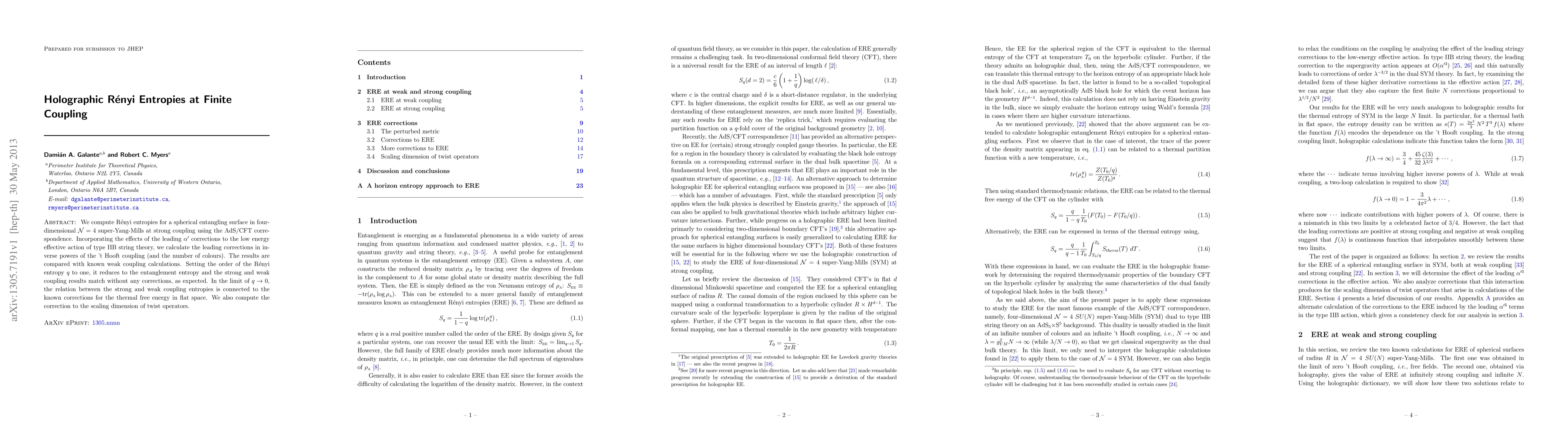 This paper computes R\'enyi entropies in four-dimensional N=4 super-Yang-Mills using the AdS/CFT correspondence, incorporating leading string theory corrections at strong coupling. The results match weak coupling calculations, with no corrections for entanglement entropy, and relate the strong and weak coupling entropies to known thermal free energy corrections.