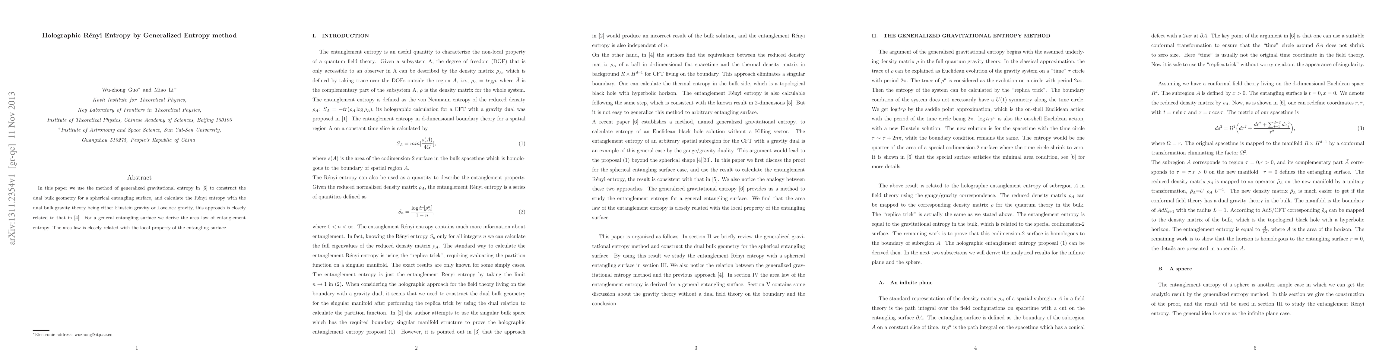 This paper constructs dual bulk geometries using generalized gravitational entropy to calculate R\'enyi entropy for spherical entangling surfaces, employing either Einstein or Lovelock gravity. The study derives an area law for entanglement entropy, linking it to the local properties of the entangling surface.