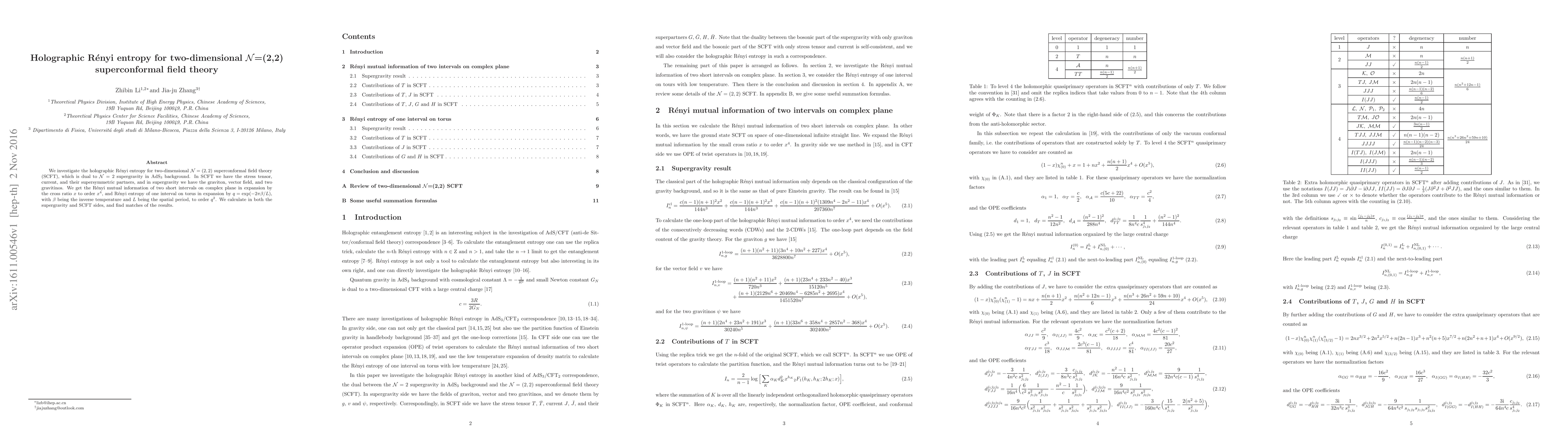 We investigate the holographic R\'enyi entropy for two-dimensional $\mathcal N=(2,2)$ superconformal field theory (SCFT), which is dual to $\mathcal N=2$ supergravity in AdS$_3$ background. In SCFT we have the stress tensor, current, and their supersymmetric partners, and in supergravity we have the graviton, vector field, and two gravitinos. We get the R\'enyi mutual information of two short intervals on complex plane in expansion by the cross ratio $x$ to order $x^4$, and R\'enyi entropy of one interval on torus in expansion by $q=\exp(-2\pi\beta/L)$, with $\beta$ being the inverse temperature and $L$ being the spatial period, to order $q^2$. We calculate in both the supergravity and SCFT sides, and find matches of the results.