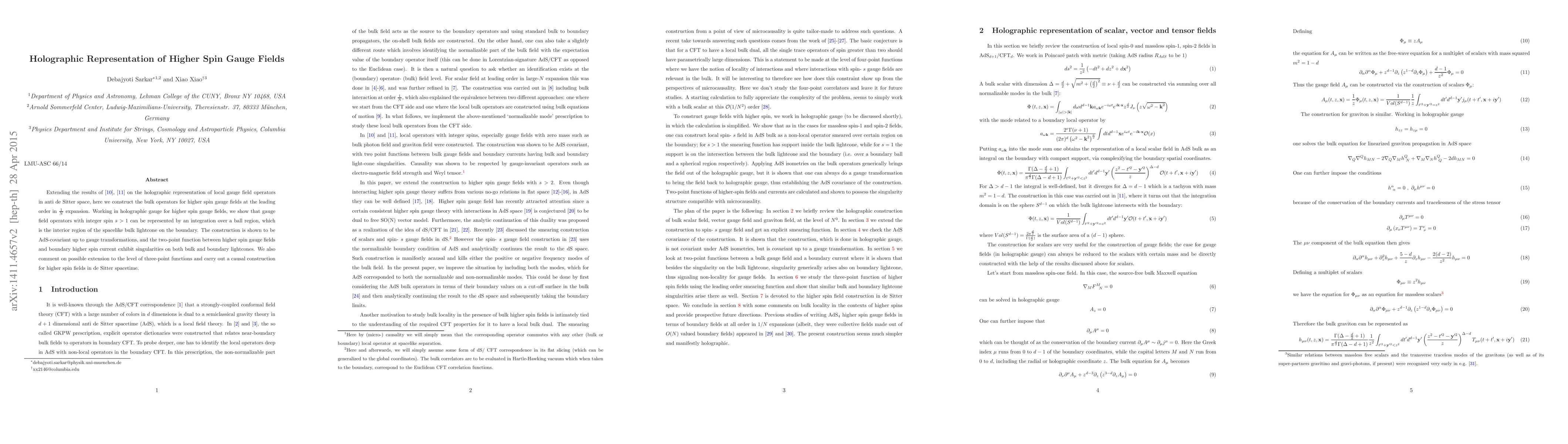 This paper constructs holographic bulk operators for higher spin gauge fields in anti-de Sitter (AdS) space using the $\frac{1}{N}$ expansion, showing AdS-covariant representations and examining singularities in two-point functions on lightcones. It also discusses potential extensions to three-point functions and applies the method to de Sitter spacetime.