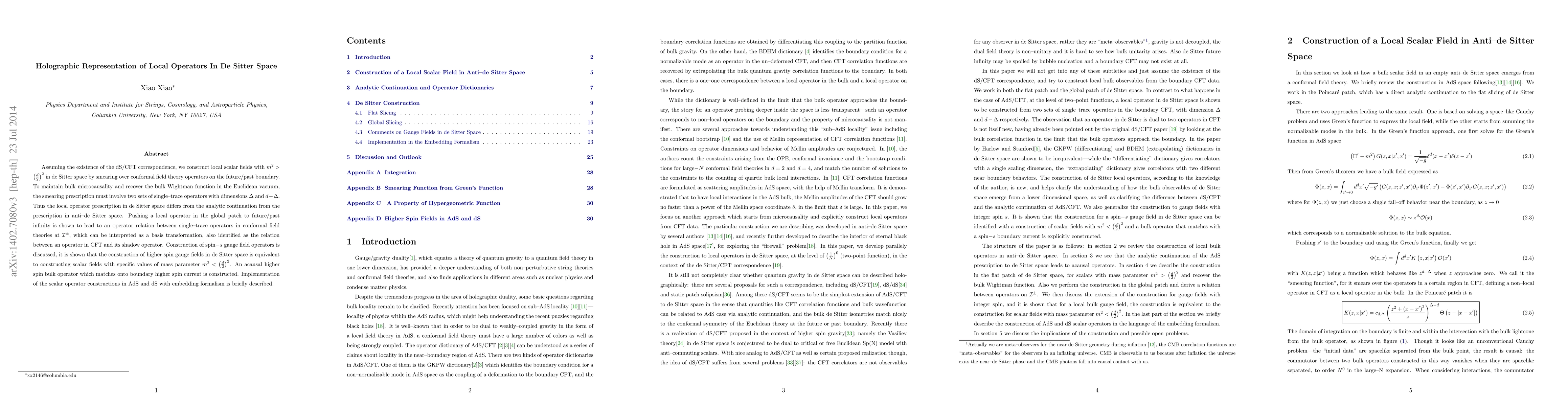 Assuming the existence of the dS/CFT correspondence, we construct local scalar fields with $m^2>\left( \frac{d}{2} \right)^2$ in de Sitter space by smearing over conformal field theory operators on the future/past boundary. To maintain bulk micro-causality and recover the bulk Wightman function in the Euclidean vacuum, the smearing prescription must involve two sets of single--trace operators with dimensions $\Delta$ and $d-\Delta$. Thus the local operator prescription in de Sitter space differs from the analytic continuation from the prescription in anti--de Sitter space. Pushing a local operator in the global patch to future/past infinity is shown to lead to an operator relation between single--trace operators in conformal field theories at $\mathcal{I}^\pm$, which can be interpreted as a basis transformation, also identified as the relation between an operator in CFT and its shadow operator. Construction of spin$-s$ gauge field operators is discussed, it is shown that the construction of higher spin gauge fields in de Sitter space is equivalent to constructing scalar fields with specific values of mass parameter $m^2<\left( \frac{d}{2} \right)^2$. An acausal higher spin bulk operator which matches onto boundary higher spin current is constructed. Implementation of the scalar operator constructions in AdS and dS with embedding formalism is briefly described.