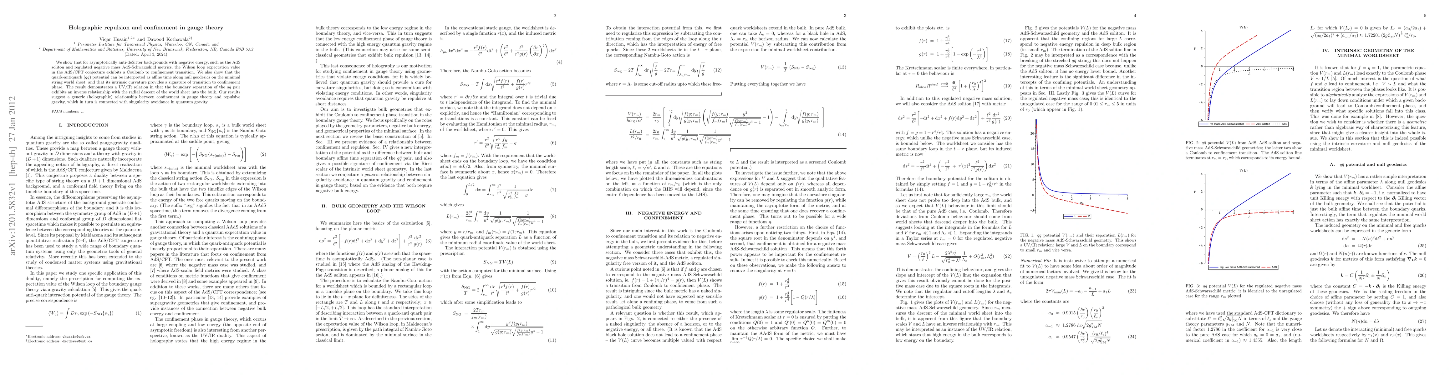 We show that for asymptotically anti-deSitter backgrounds with negative energy, such as the AdS soliton and regulated negative mass AdS-Schwarzshild metrics, the Wilson loop expectation value in the AdS/CFT conjecture exhibits a Coulomb to confinement transition. We also show that the quark-antiquark ($q \bar q$) potential can be interpreted as affine time along null geodesics on the minimal string world sheet,and that its intrinsic curvature provides a signature of transition to confinement phase. The result demonstrates a UV/IR relation in that the boundary separation of the $q \bar{q}$ pair exhibits an inverse relationship with the radial descent of the world sheet into the bulk. Our results suggest a generic (holographic) relationship between confinement in gauge theory and repulsive gravity, which in turn is connected with singularity avoidance in quantum gravity.