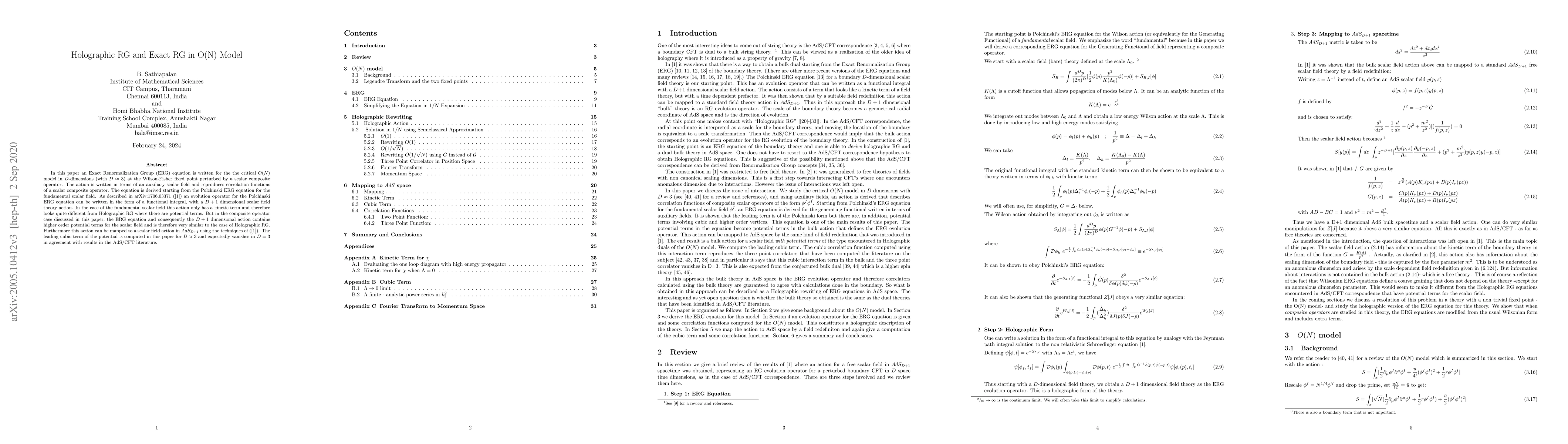 This paper derives an Exact Renormalization Group (ERG) equation for the critical $O(N)$ model in $D$-dimensions near the Wilson-Fisher fixed point, perturbed by a scalar composite operator. The ERG equation, similar to Holographic RG in higher dimensions, includes potential terms and is mapped to a scalar field action in $AdS_{D+1}$, with the leading cubic term vanishing in $D=3$.