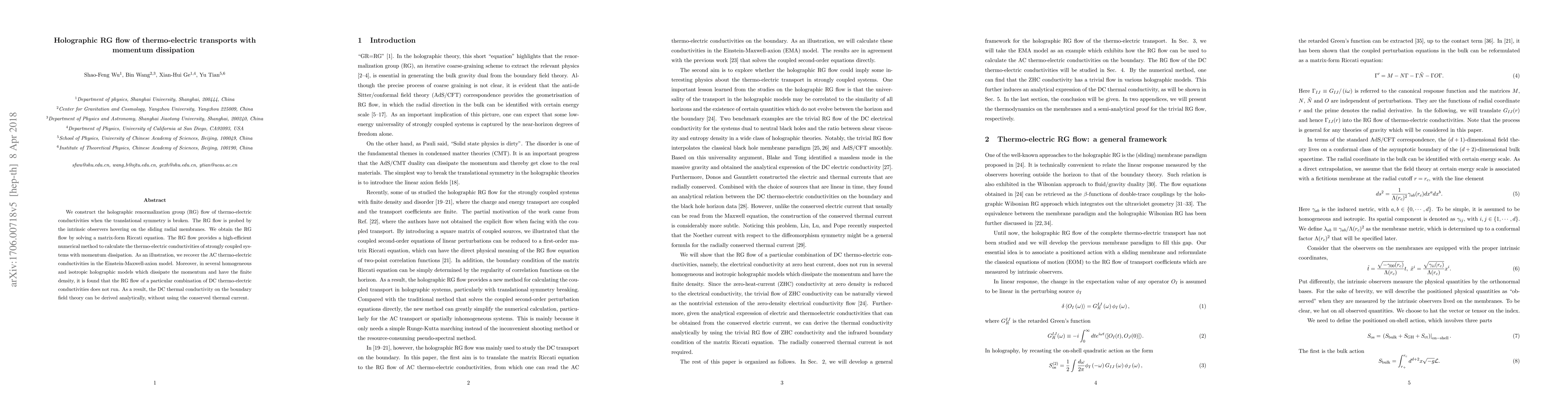 This paper constructs a holographic renormalization group (RG) flow to analyze thermo-electric transports in systems with broken translational symmetry and momentum dissipation. The RG flow is numerically efficient and reveals that certain combinations of DC thermo-electric conductivities do not run, allowing for the analytical derivation of DC thermal conductivity without relying on the conserved thermal current.