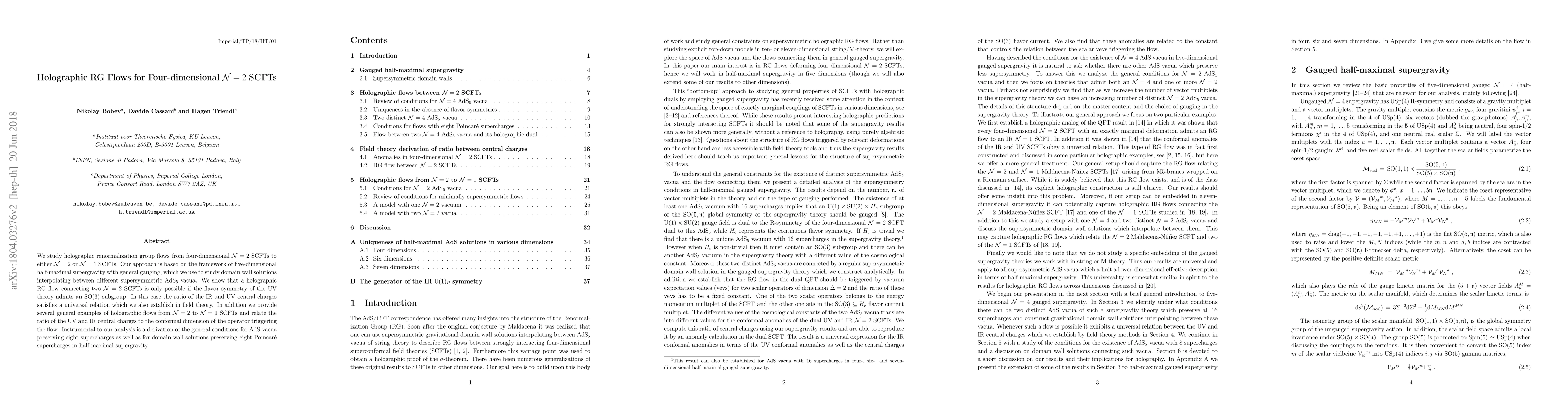 This paper investigates holographic renormalization group (RG) flows from four-dimensional $\mathcal{N}=2$ superconformal field theories (SCFTs) to either $\mathcal{N}=2$ or $\mathcal{N}=1$ SCFTs, showing that a connection between two $\mathcal{N}=2$ SCFTs is possible only if the UV theory's flavor symmetry contains an ${\rm SO}(3)$ subgroup, and establishes a universal relation for the ratio of IR and UV central charges.