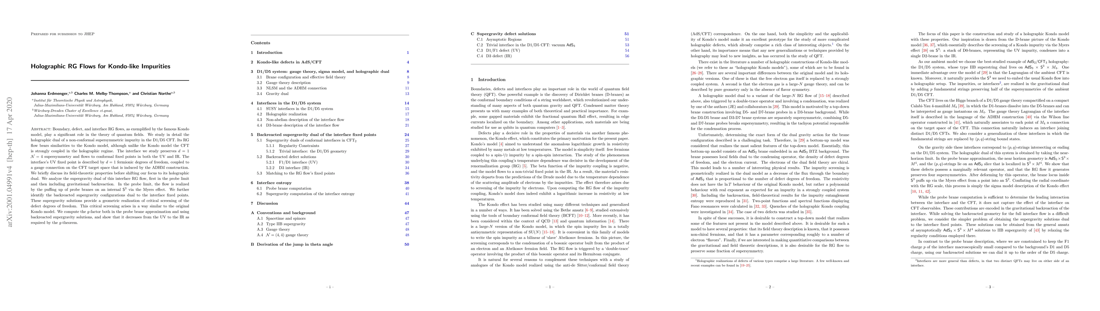 This paper examines the holographic dual of a non-conformal supersymmetric impurity in the D1/D5 CFT, finding its RG flow similar to the Kondo model but with strong coupling. The study details supergravity duals, including configurations with gravitational backreaction, and reveals geometric realizations of critical screening akin to the Kondo model, showing a decreasing $g$-factor from UV to IR as predicted by the $g$-theorem.