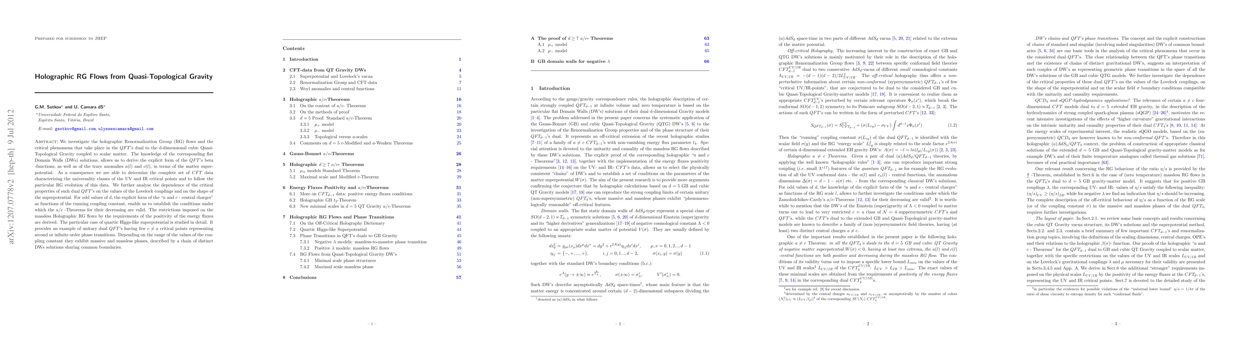 We investigate the holographic Renormalization Group (RG) flows and the critical phenomena that take place in the $QFT$'s dual to the d-dimensional cubic Quasi-Topological Gravity coupled to scalar matter. The knowledge of the corresponding flat Domain Walls(DWs) solutions, allows us to derive the explicit form of the $QFT$'s beta-functions as well as of the trace anomalies $a(l)$ and $c(l)$-functions in terms of the matter superpotential. As a consequence we are able to determine the complete set of $CFT$ data characterizing the universality classes of the UV and IR critical points and to follow the particular RG evolution of this data. We further analyse the dependence of the critical properties of such dual $QFT$'s on the values of the Lovelock couplings and on the shape of the superpotential. For odd values of $d$, the explicit form of the "a- and c- central charges" as functions of the running coupling constant, enable us to establish the conditions under which the $a/c$-Theorems for their decreasing are valid. The restrictions imposed on the massless Holographic RG flows by the requirements of the positivity of the energy fluxes are derived. The particular case of quartic Higgs-like superpotential is studied in detail. It provides an example of unitary dual $QFT$'s having few $c\ne a$ critical points representing second or infinite order phase transitions. Depending on the range of the values of the coupling constant they exhibit massive and massless phases, described by a chain of distinct DWs solutions sharing common boundaries.