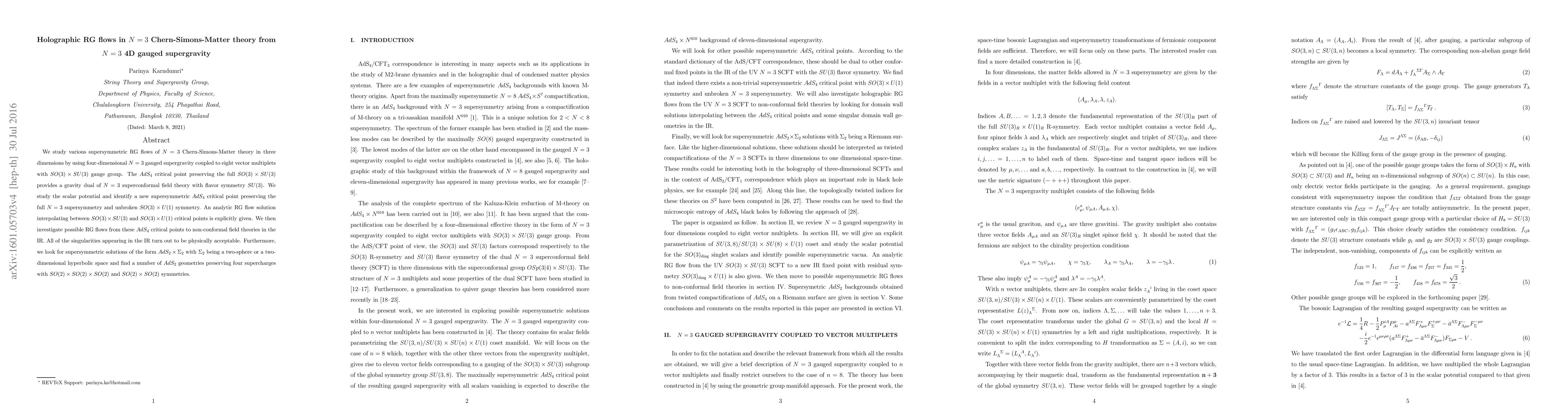 Researchers studied supersymmetric RG flows in N=3 Chern-Simons-Matter theory from 4D gauged supergravity, finding new critical points and geometries with preserved symmetries.