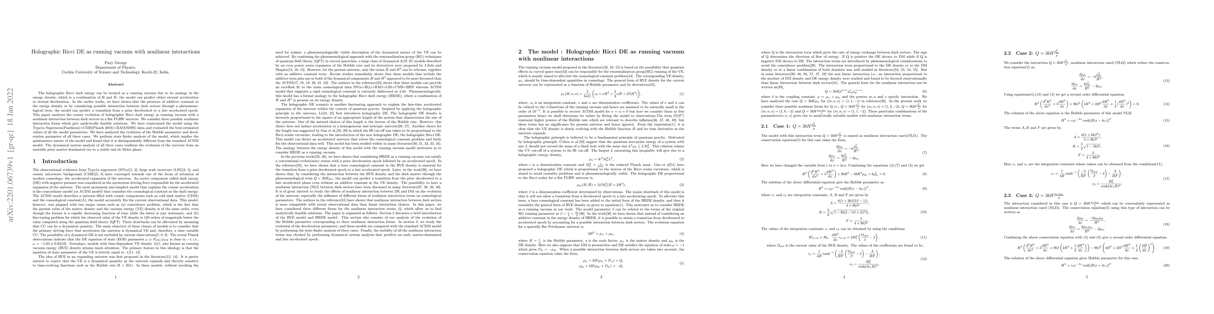 The holographic Ricci dark energy can be treated as a running vacuum due to its analogy in the energy density, which is a combination of $H$ and $\dot H$, the model can predict either eternal acceleration or eternal deceleration. In the earlier works, we have shown that the presence of additive constant in the energy density or by considering possible interaction between dark sectors through a phenomenological term, the model can predict a transition from a prior decelerated to a late accelerated epoch. This paper analyses the cosmic evolution of holographic Ricci dark energy as a running vacuum with a nonlinear interaction between dark sectors in a flat FLRW universe. We consider three possible nonlinear interaction forms which give analytically feasible solutions. We have constrained the model using the Type1a Supernova(Pantheon)+CMB(Planck 2018)+BAO(SDSS) data and evaluated the best-estimated values of all the model parameters. We have analyzed the evolution of the Hubble parameter and deceleration parameter of all three cases. We perform state finder analysis of the model, which implies the quintessence nature of the model and found that it is distinguishably different from the standard $\Lambda$CDM model. The dynamical system analysis of all three cases confirms the evolution of the universe from an unstable prior matter-dominated era to a stable end de Sitter phase.