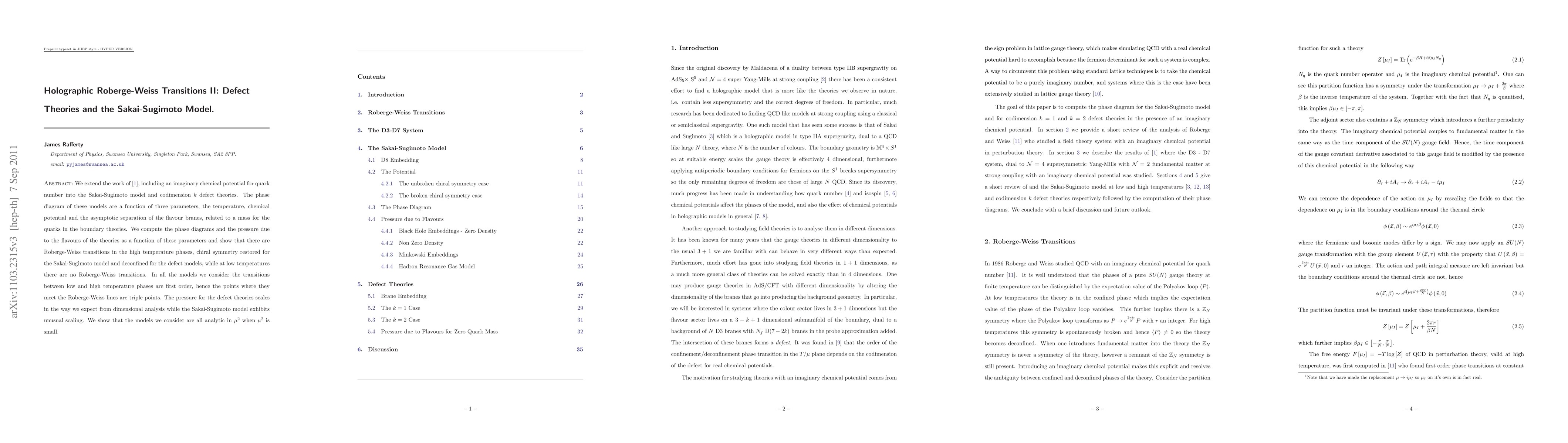 This paper extends the Sakai-Sugimoto model and codimension k defect theories by incorporating an imaginary chemical potential, revealing the presence of Roberge-Weiss transitions in high-temperature phases and first-order transitions between low and high-temperature phases. The study also highlights unusual scaling behavior in the Sakai-Sugimoto model compared to defect theories.