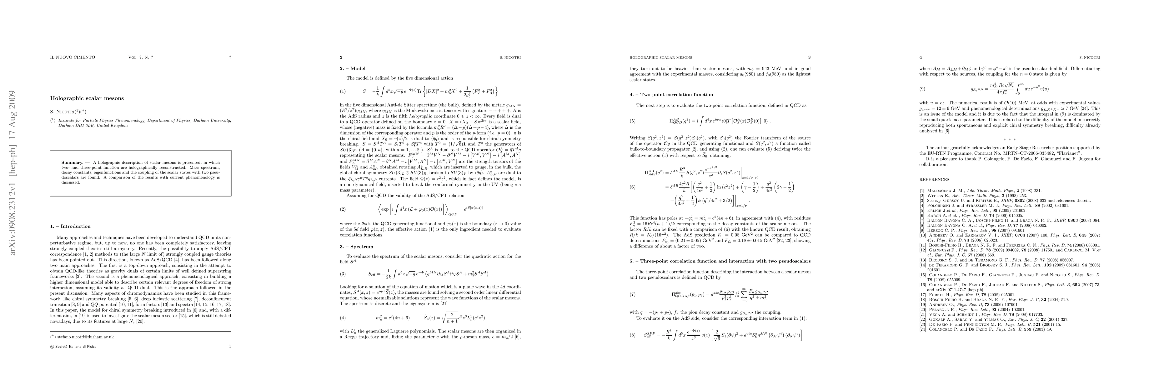 The paper provides a holographic model for scalar mesons, successfully reconstructing their two- and three-point functions. It determines the mass spectrum, decay constants, eigenfunctions, and coupling of scalar states with two pseudoscalars, comparing these findings with current phenomenological data.