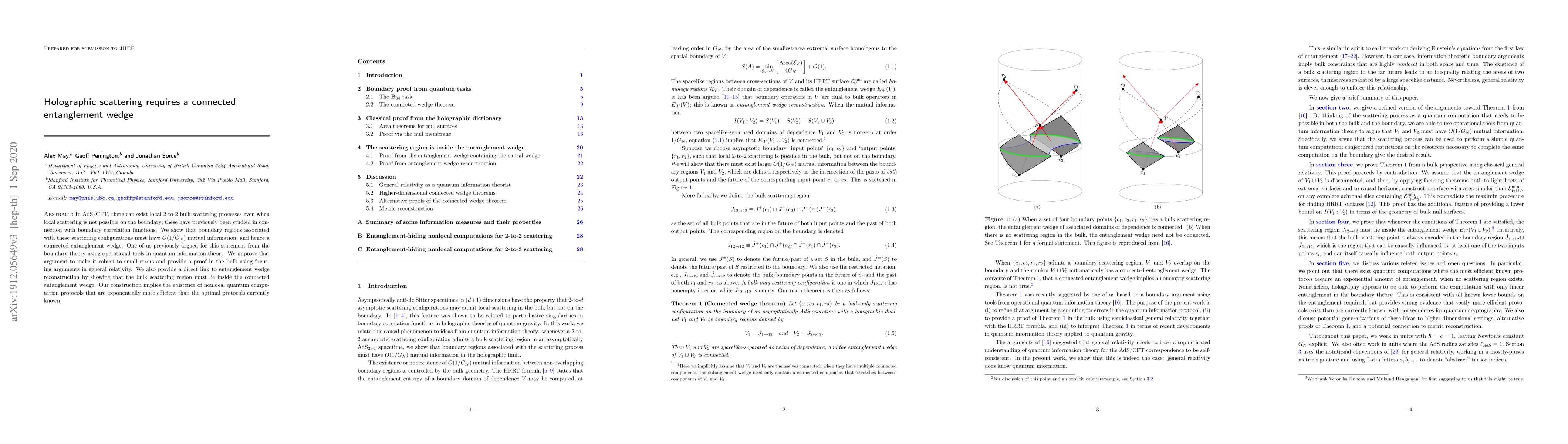 The paper presents a proof of the connected entanglement wedge theorem using bulk general relativity, linking it to holographic scattering and entanglement wedge reconstruction, and providing insights into nonlocal quantum computation protocols.