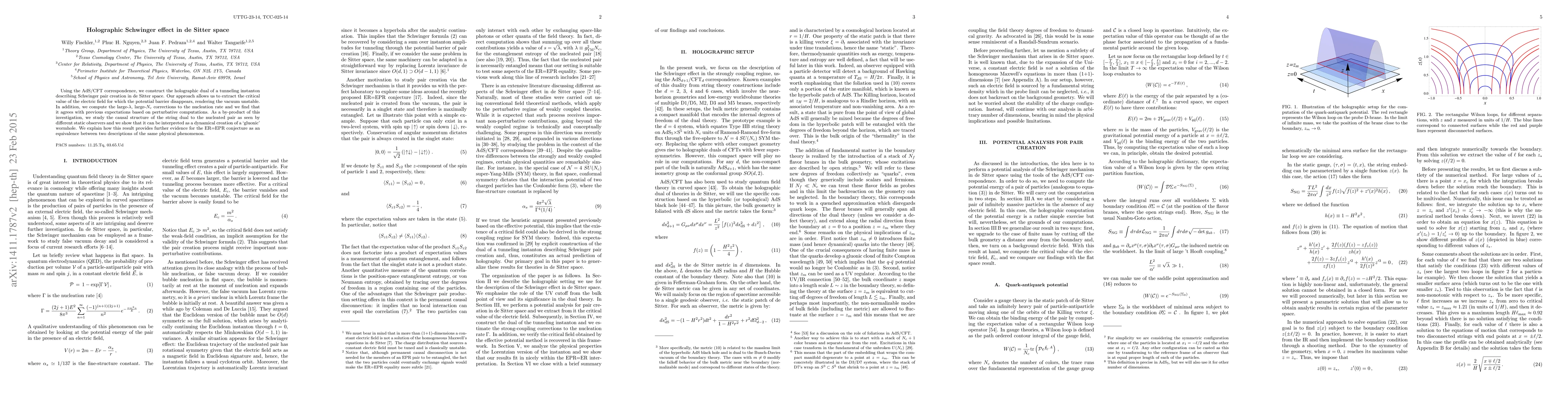 Using the AdS/CFT correspondence, we construct the holographic dual of a tunneling instanton describing Schwinger pair creation in de Sitter space. Our approach allows us to extract the critical value of the electric field for which the potential barrier disappears, rendering the vacuum unstable. In addition, we compute the large-$\lambda$, large-$N_c$ corrections to the nucleation rate and we find that it agrees with previous expectations based on perturbative computations. As a by-product of this investigation, we study the causal structure of the string dual to the nucleated pair as seen by different static observers and we show that it can be interpreted as a dynamical creation of a `gluonic' wormhole. We explain how this result provides further evidence for the ER=EPR conjecture as an equivalence between two descriptions of the same physical phenomenon.