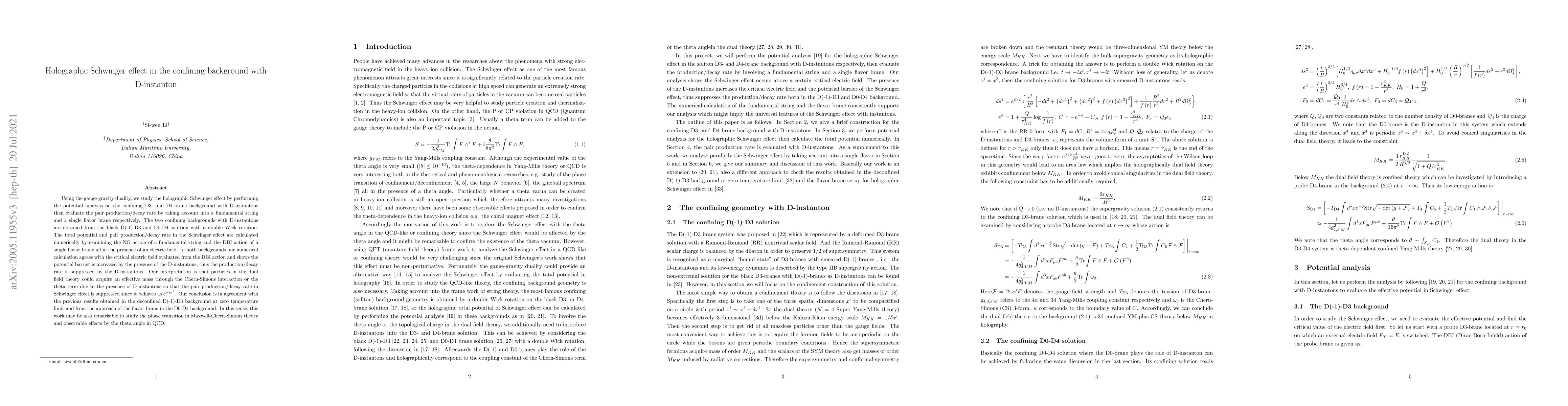 Using the gauge-gravity duality, we study the holographic Schwinger effect by performing the potential analysis on the confining D3- and D4-brane background with D-instantons then evaluate the pair production/decay rate by taking account into a fundamental string and a single flavor brane respectively. The two confining backgrounds with D-instantons are obtained from the black D(-1)-D3 and D0-D4 solution with a double Wick rotation. The total potential and pair production/decay rate in the Schwinger effect are calculated numerically by examining the NG action of a fundamental string and the DBI action of a single flavor brane all in the presence of an electric field. In both backgrounds our numerical calculation agrees with the critical electric field evaluated from the DBI action and shows the potential barrier is increased by the presence of the D-instantons, thus the production/decay rate is suppressed by the D-instantons. Our interpretation is that particles in the dual field theory could acquire an effective mass through the Chern-Simons interaction or the theta term due to the presence of D-instantons so that the pair production/decay rate in Schwinger effect is suppressed since it behaves as $e^{-m^{2}}$. Our conclusion is in agreement with the previous results obtained in the deconfined D(-1)-D3 background at zero temperature limit and from the approach of the flavor brane in the D0-D4 background. In this sense, this work may be also remarkable to study the phase transition in Maxwell-Chern-Simons theory and observable effects by the theta angle in QCD.