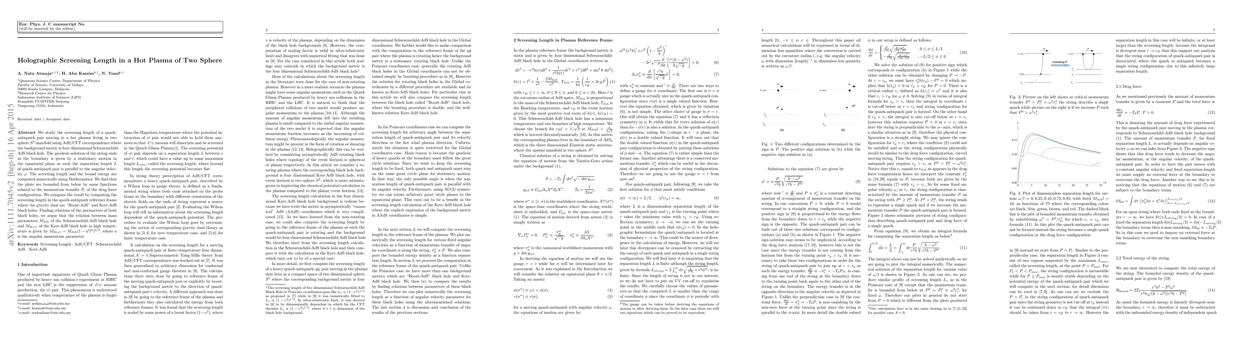 We study the screening length of a quark-antiquark pair moving in a hot plasma living in two sphere $S^2$ manifold using AdS/CFT correspondence where the background metric is four dimensional Schwarzschild-AdS black hole. The geodesic solution of the string ends at the boundary is given by a stationary motion in the equatorial plane as such the separation length $L$ of quark-antiquark pair is parallel to the angular velocity $\omega$. The screening length and the bound energy are computed numerically using Mathematica. We find that the plots are bounded from below by some functions related to the momentum transfer $P_c$ of the drag force configuration. We compare the result by computing the screening length in the quark-antiquark reference frame where the gravity dual are "Boost-AdS" and Kerr-AdS black holes. Finding relations of the parameters of both black holes, we argue that the relation between mass parameters $M_{Sch}$ of the Schwarzschild-AdS black hole and $M_{Kerr}$ of the Kerr-AdS black hole in high temperature is given by $M_{Kerr}=M_{Sch}(1-a^2l^2)^{3/2}$, where $a$ is the angular momentum parameter.