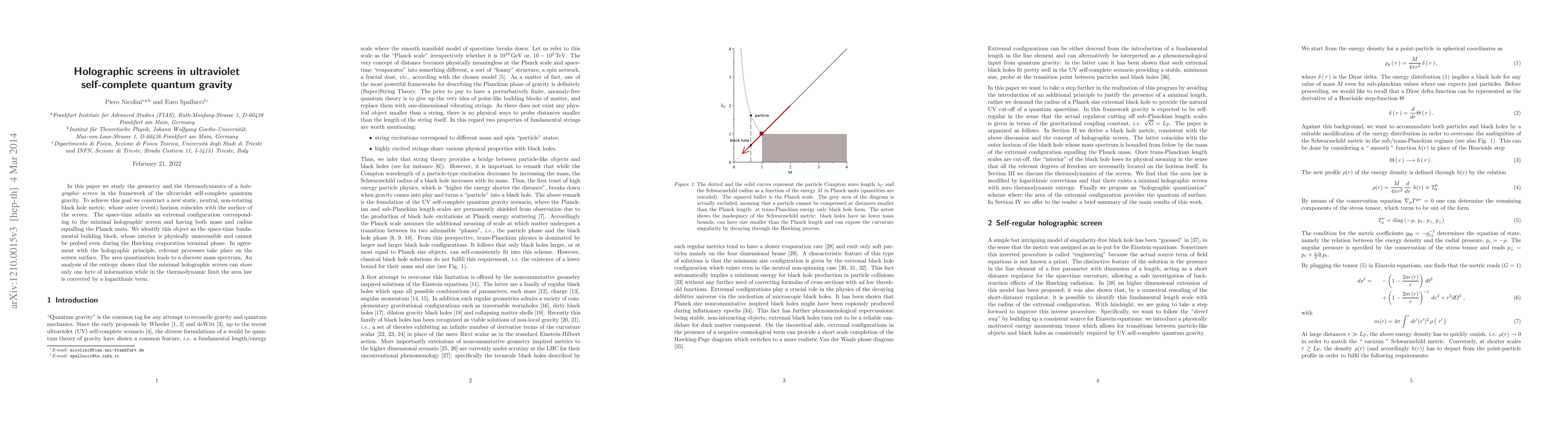 In this paper we study the geometry and the thermodynamics of a holographic screen in the framework of the ultraviolet self-complete quantum gravity. To achieve this goal we construct a new static, neutral, non-rotating black hole metric, whose outer (event) horizon coincides with the surface of the screen. The space-time admits an extremal configuration corresponding to the minimal holographic screen and having both mass and radius equalling the Planck units. We identify this object as the space-time fundamental building block, whose interior is physically unaccessible and cannot be probed even during the Hawking evaporation terminal phase. In agreement with the holographic principle, relevant processes take place on the screen surface. The area quantization leads to a discrete mass spectrum. An analysis of the entropy shows that the minimal holographic screen can store only one byte of information while in the thermodynamic limit the area law is corrected by a logarithmic term.