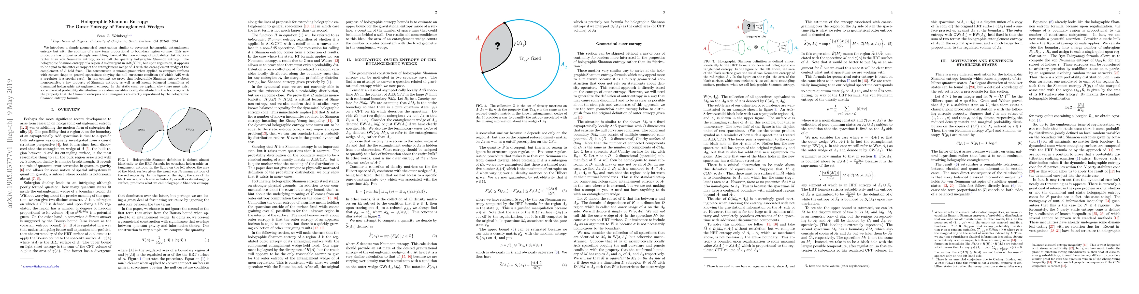 This paper introduces a new concept called holographic Shannon entropy, which extends holographic entanglement entropy by including a boundary region volume term, resembling classical Shannon entropy. Despite divergence in AdS/CFT, regulated holographic Shannon entropy corresponds to the outer entropy of entanglement wedges, and it satisfies monotonicity and balanced inequalities, akin to Shannon entropy.