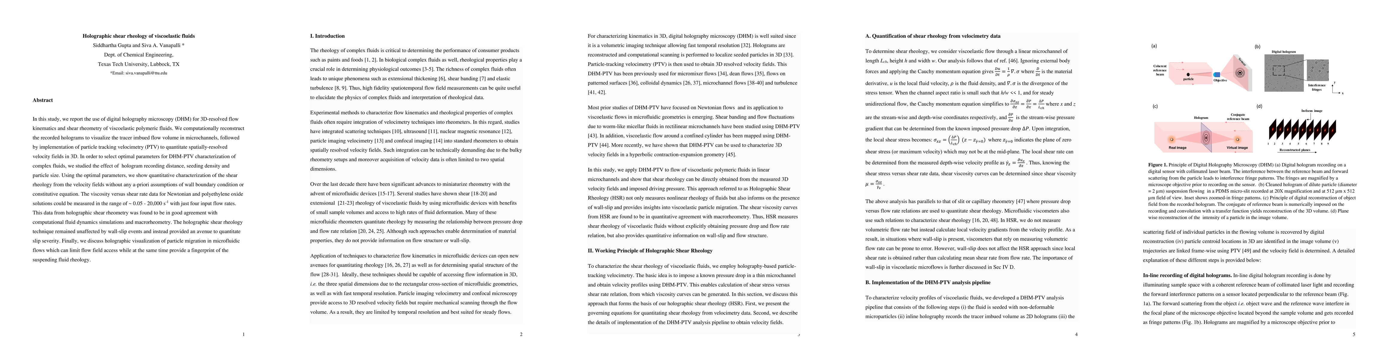 In this study, we report the use of digital holography microscopy (DHM) for 3D-resolved flow kinematics and shear rheometry of viscoelastic polymeric fluids. We computationally reconstruct the recorded holograms to visualize the tracer imbued flow volume in microchannels, followed by implementation of particle tracking velocimetry (PTV) to quantitate spatially-resolved velocity fields in 3D. In order to select optimal parameters for DHM-PTV characterization of complex fluids, we studied the effect of hologram recording distance, seeding density and particle size. Using the optimal parameters, we show quantitative characterization of the shear rheology from the velocity fields without any a-priori assumptions of wall boundary condition or constitutive equation. The viscosity versus shear rate data for Newtonian and polyethylene oxide solutions could be measured in the range of ~ 0.05 - 20,000 s-1 with just four input flow rates. This data from holographic shear rheometry was found to be in good agreement with computational fluid dynamics simulations and macrorheometry. The holographic shear rheology technique remained unaffected by wall-slip events and instead provided an avenue to quantitate slip severity. Finally, we discuss holographic visualization of particle migration in microfluidic flows which can limit flow field access while at the same time provide a fingerprint of the suspending fluid rheology.