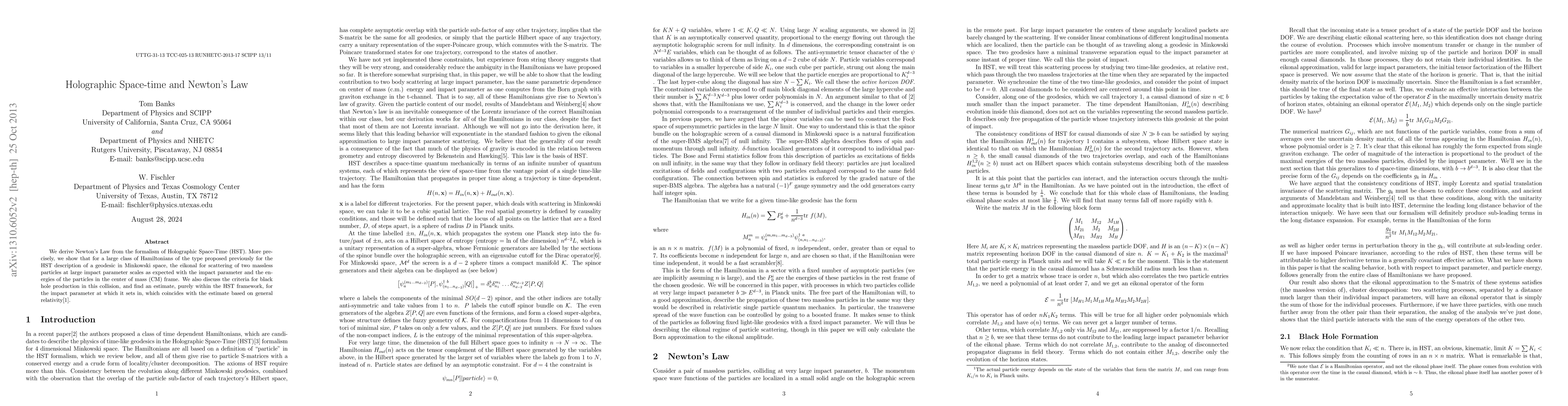 We derive Newton's Law from the formalism of Holographic Space-Time (HST). More precisely, we show that for a large class of Hamiltonians of the type proposed previously for the HST description of a geodesic in Minkowski space, the eikonal for scattering of two massless particles at large impact parameter scales as expected with the impact parameter and the energies of the particles in the center of mass (CM) frame. We also discuss the criteria for black hole production in this collision, and find an estimate, purely within the HST framework, for the impact parameter at which it sets in, which coincides with the estimate based on general relativity.