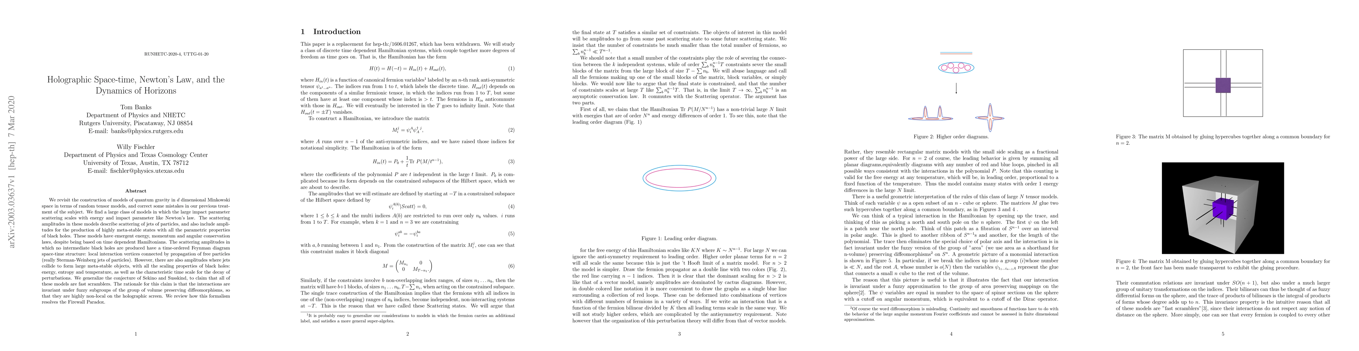 We revisit the construction of models of quantum gravity in d dimensional Minkowski space in terms of random tensor models, and correct some mistakes in our previous treatment of the subject. We find a large class of models in which the large impact parameter scattering scales with energy and impact parameter like Newton`s law. The scattering amplitudes in these models describe scattering of jets of particles, and also include amplitudes for the production of highly meta-stable states with all the parametric properties of black holes. These models have emergent energy, momentum and angular conservation laws, despite being based on time dependent Hamiltonians. The scattering amplitudes in which no intermediate black holes are produced have a time-ordered Feynman diagram space-time structure: local interaction vertices connected by propagation of free particles (really Sterman-Weinberg jets of particles). However, there are also amplitudes where jets collide to form large meta-stable objects, with all the scaling properties of black holes: energy, entropy and temperature, as well as the characteristic time scale for the decay of perturbations. We generalize the conjecture of Sekino and Susskind, to claim that all of these models are fast scramblers. The rationale for this claim is that the interactions are invariant under fuzzy subgroups of the group of volume preserving diffeomorphisms, so that they are highly non-local on the holographic screen. We review how this formalism resolves the Firewall Paradox.