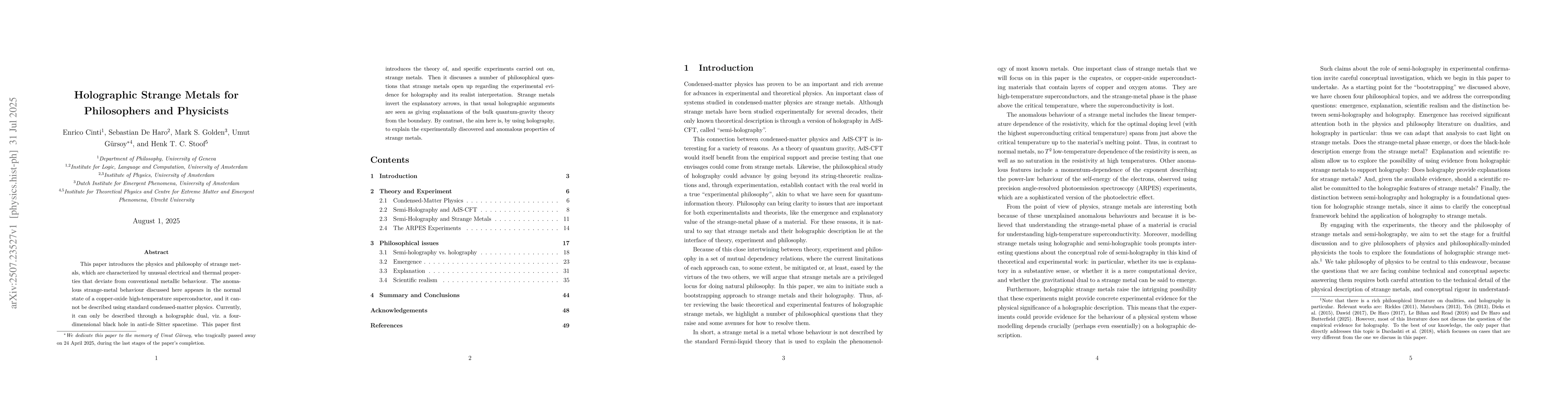 This paper introduces the physics and philosophy of strange metals, which are characterized by unusual electrical and thermal properties that deviate from conventional metallic behaviour. The anomalous strange-metal behaviour discussed here appears in the normal state of a copper-oxide high-temperature superconductor, and it cannot be described using standard condensed-matter physics. Currently, it can only be described through a holographic dual, viz.~a four-dimensional black hole in anti-de Sitter spacetime. This paper first introduces the theory of, and specific experiments carried out on, strange metals. Then it discusses a number of philosophical questions that strange metals open up regarding the experimental evidence for holography and its realist interpretation. Strange metals invert the explanatory arrows, in that usual holographic arguments are seen as giving explanations of the bulk quantum-gravity theory from the boundary. By contrast, the aim here is, by using holography, to explain the experimentally discovered and anomalous properties of strange metals.